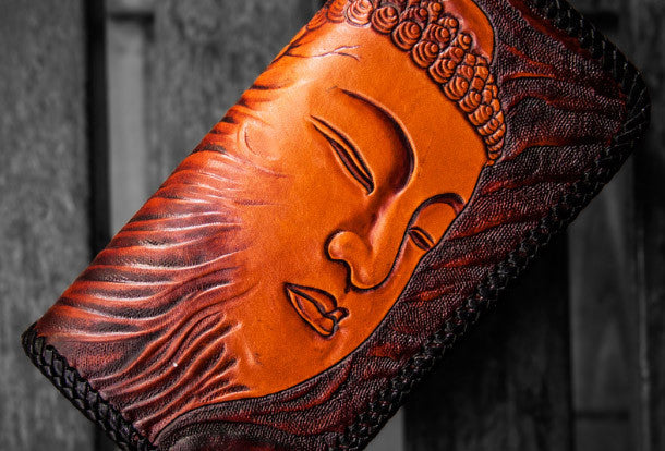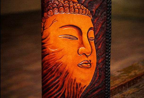 Design: Black?Carved Tooled buddha Clutch Long?Leather Wallet