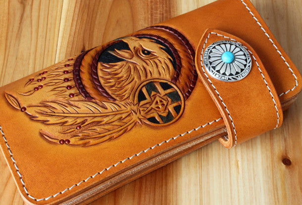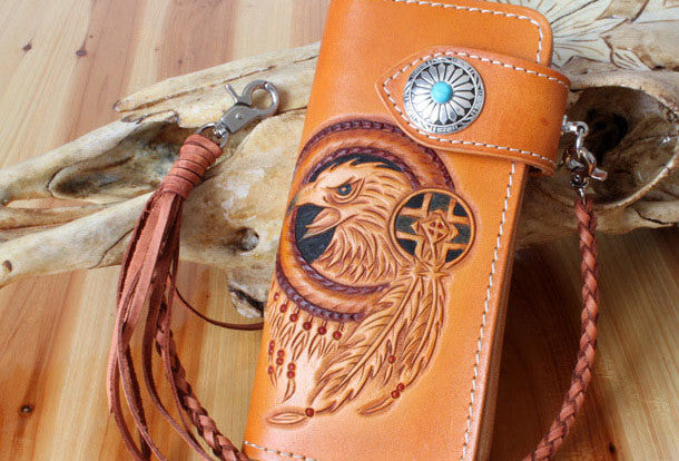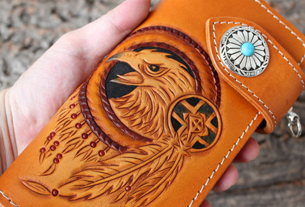 This is Handmade leather eagle carved brown?biker wallet chain?Long wallet clutch for men.The wallet is bifold,color is brown.There are 3?full size bill slots/holders, 10 ID/credit card slots/holders,1 coin slot~Handmade in the traditional method with punched holes and saddle stitching by hand.