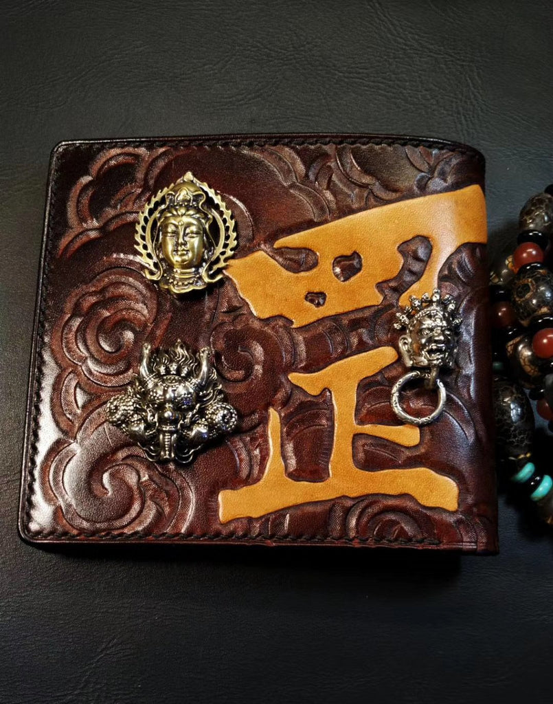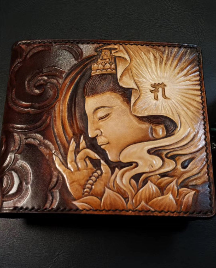 Design: Handmade Leather Avalokitesvara Tooled Mens billfold Wallet Cool Leather Wallet Slim Wallet for Men