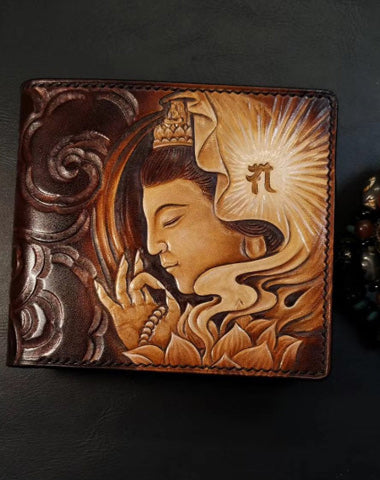 Style: Handmade Leather Avalokitesvara Tooled Mens billfold Wallet Cool Leather Wallet Slim Wallet for Men