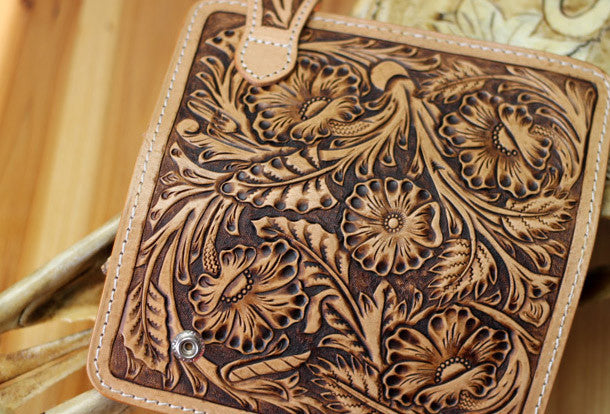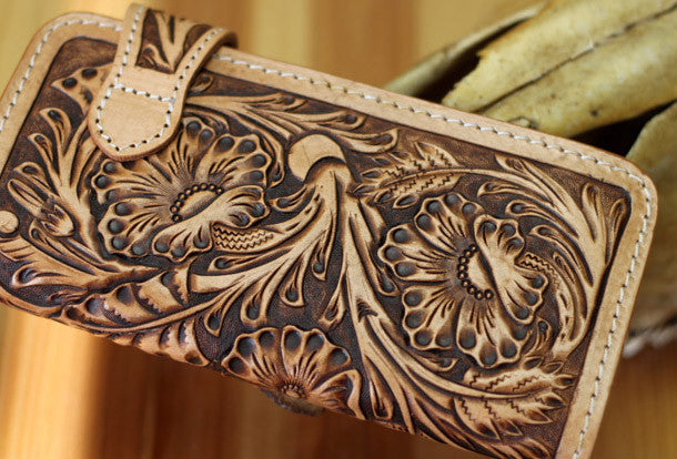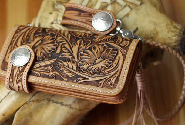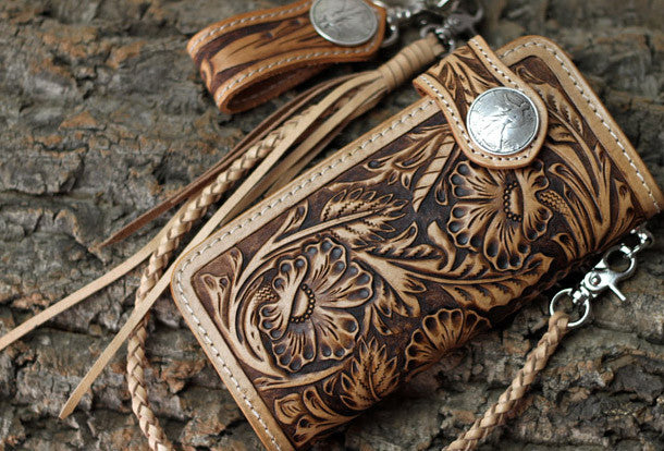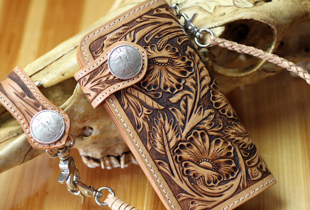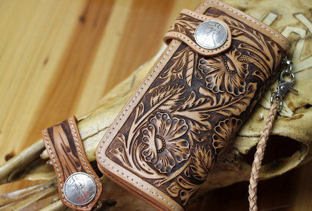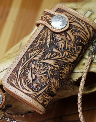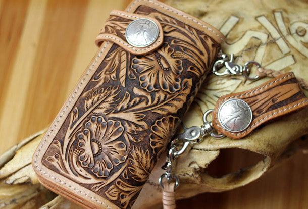 This is handmade natural Italian Vegetable Tanned leather long floral carved biker wallet purse clutch for men.The wallet is bifold,color is beige.There are 3?full size bill slots/holders, 10 ID/credit card slots/holders, 1 zip coin slot/holder~Hand-made in the traditional method with punched holes and saddle stitching by hand.