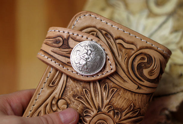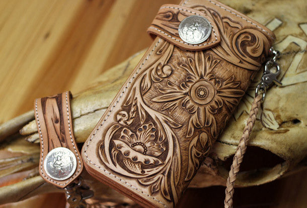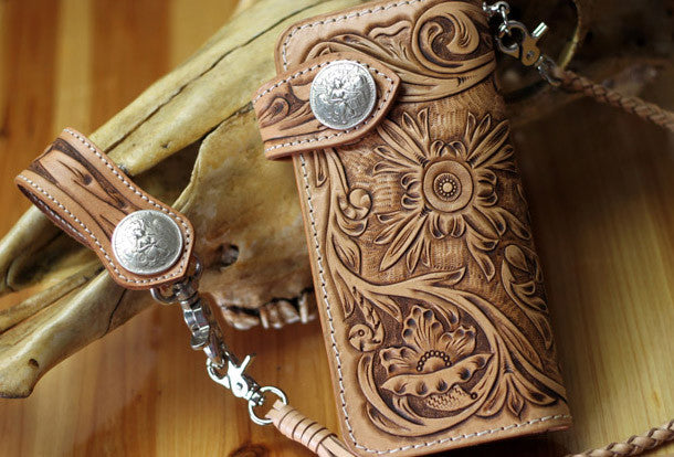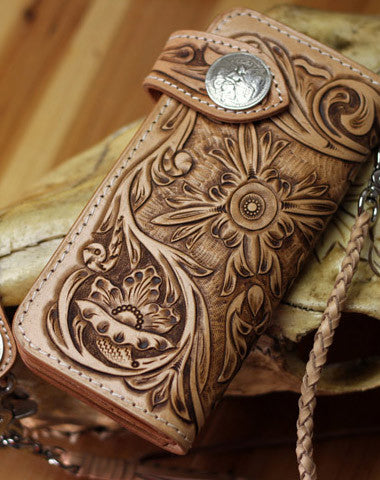 This is handmade natural Italian Vegetable Tanned leather long floral carved biker wallet purse clutch for men.The wallet is bifold,color is beige.There are 3 ful