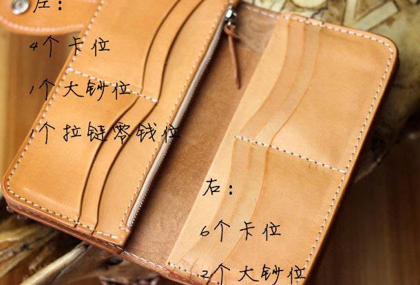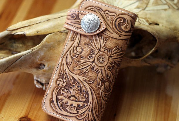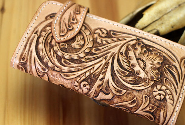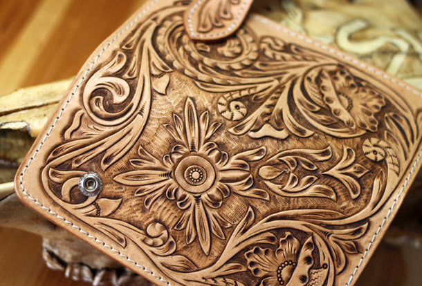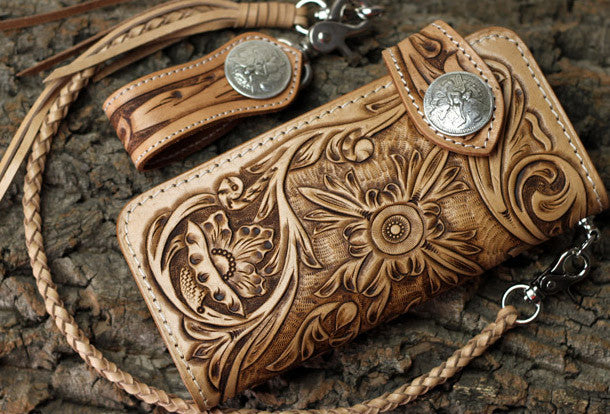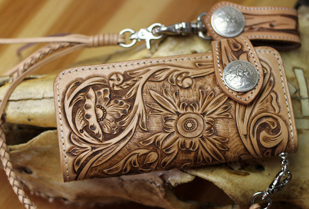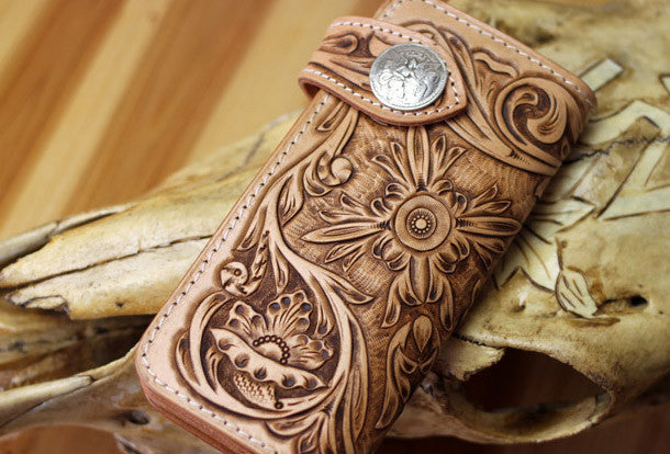 This is handmade natural Italian Vegetable Tanned leather long floral carved biker wallet purse clutch for men.The wallet is bifold,color is beige.There are 3 full size bill slots/holders, 10 ID/credit card slots/holders, 1 zip coin slot/holder~Hand-made in the traditional method with punched holes and saddle stitching by hand.