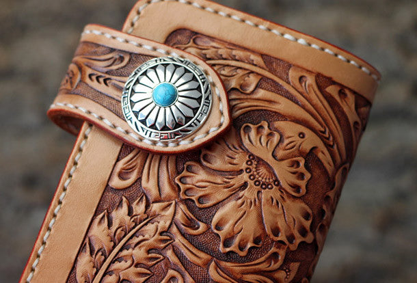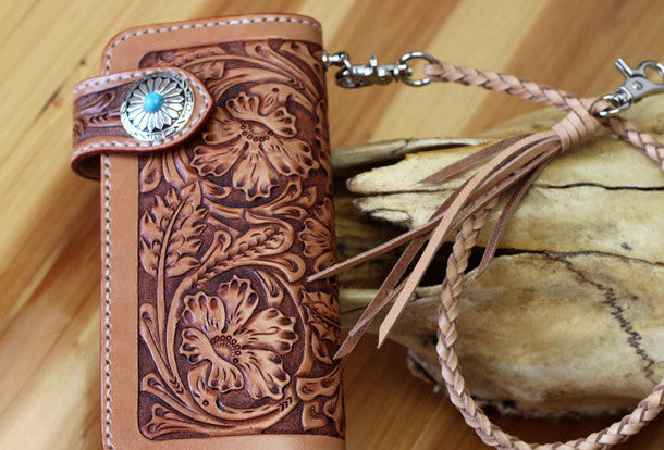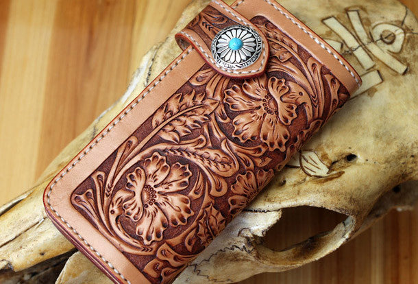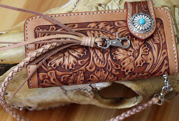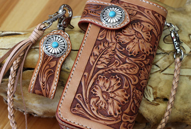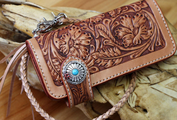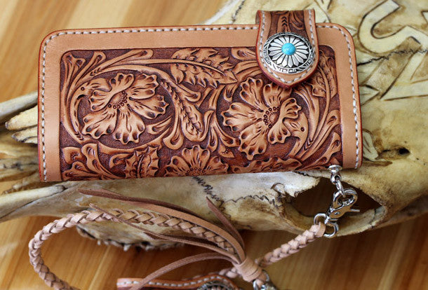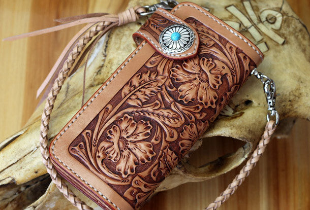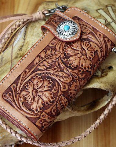 This is handmade natural Italian Vegetable Tanned leather long floral carved biker wallet purse clutch for men.The wallet is bifold,color is brown.There are 3?full size bill slots/holders, 10 ID/credit card slots/holders, 1 zip coin slot/holder~Hand-made in the traditional method with punched holes and saddle stitching by hand.