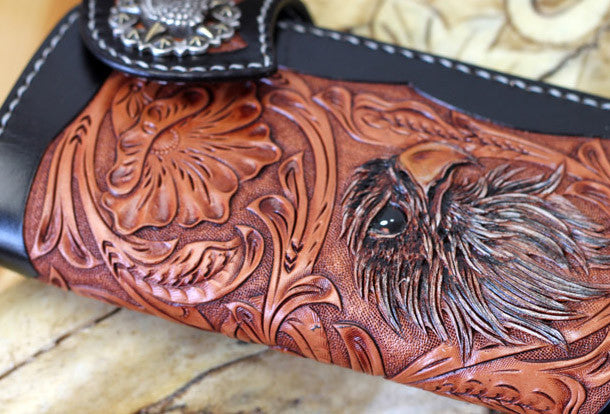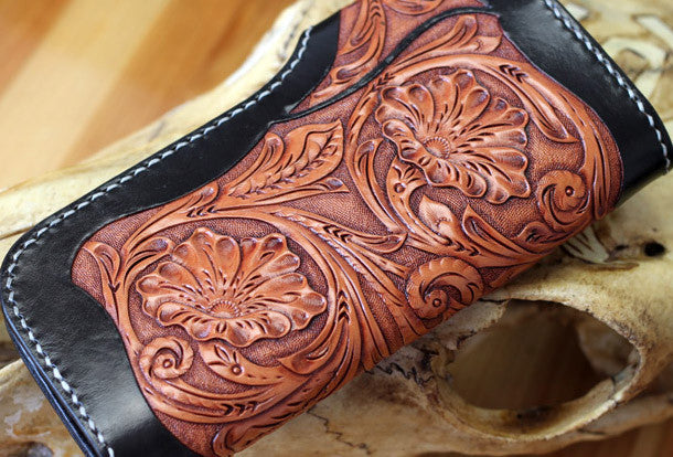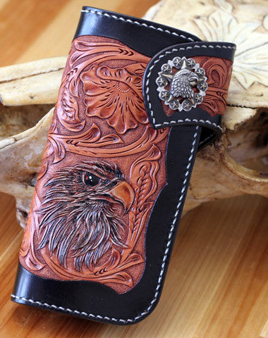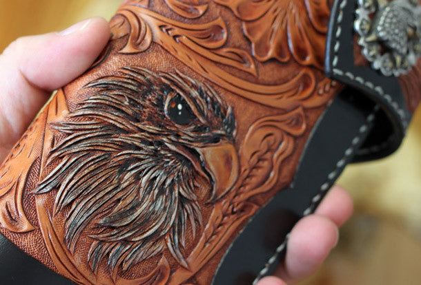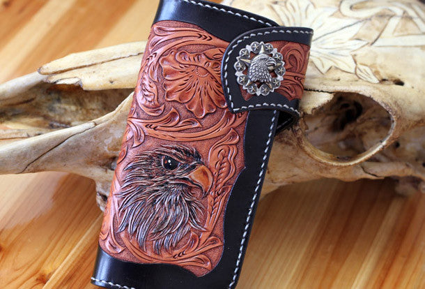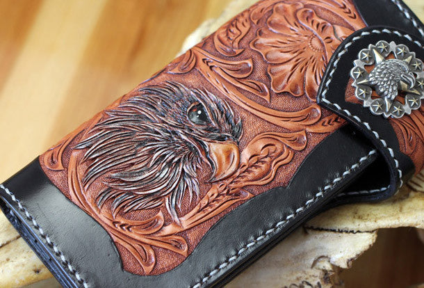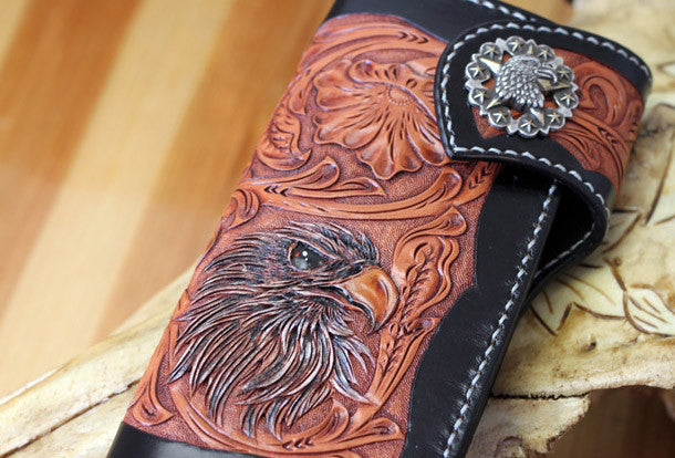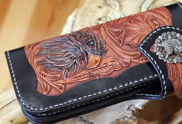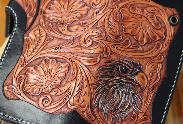 This is Handmade leather floral eagle carved black biker wallet chain Long wallet for men.The wallet is bifold,color is black.There are 3?full size bill slots/holders, 10 ID/credit card slots/holders,1 coin slot~Handmade in the traditional method with punched holes and saddle stitching by hand.