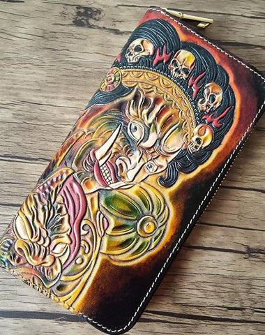 Design: Handmade Leather Mahākāla Tooled Mens Long Wallet Cool Leather Wallet Clutch Wallet for Men