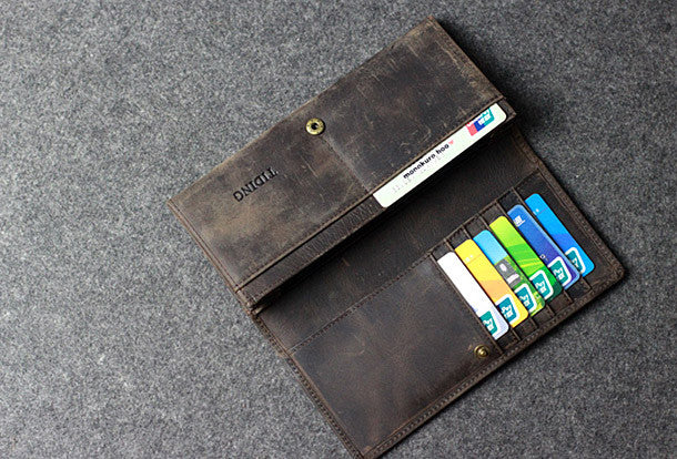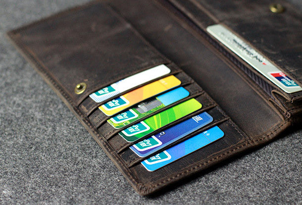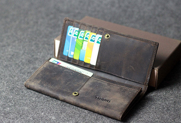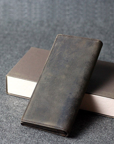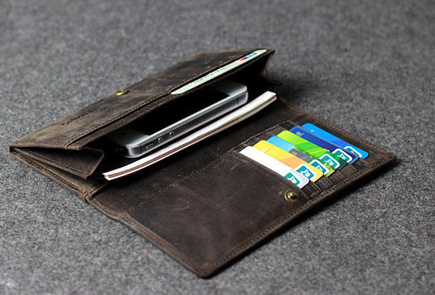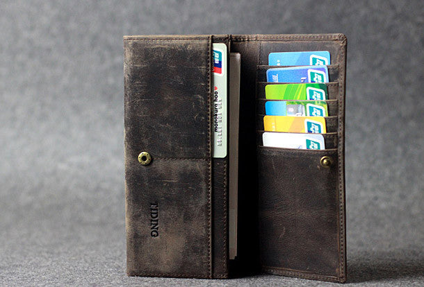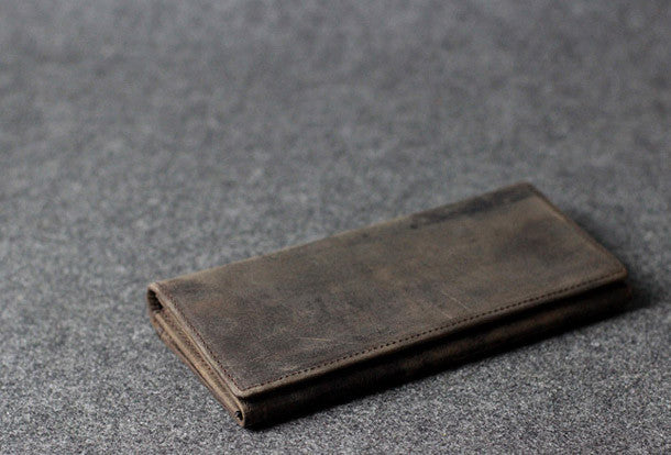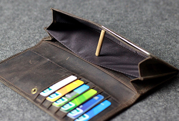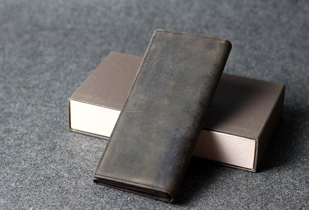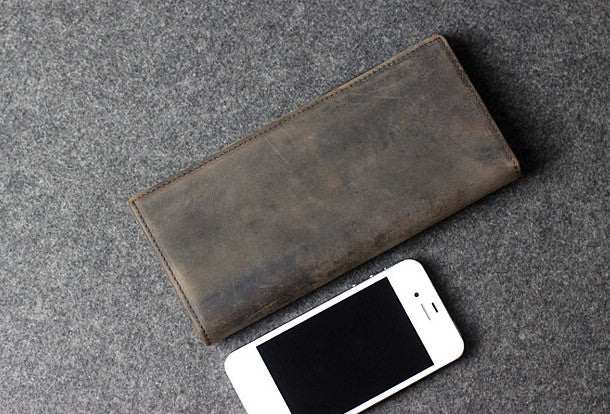This is Handmade leather men clutch long wallet vintage clutch long wallet purse clutch.The wallet is bifold,color is gray coffee.There are 2?full size bill slots/holders,6 ID/credit card slots/holders,2?ID?holder,1 phone?holder.