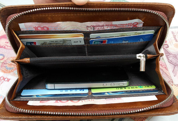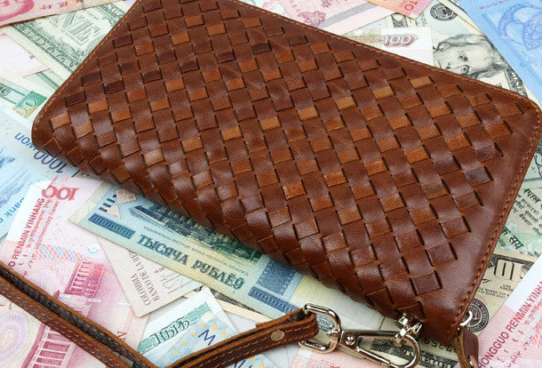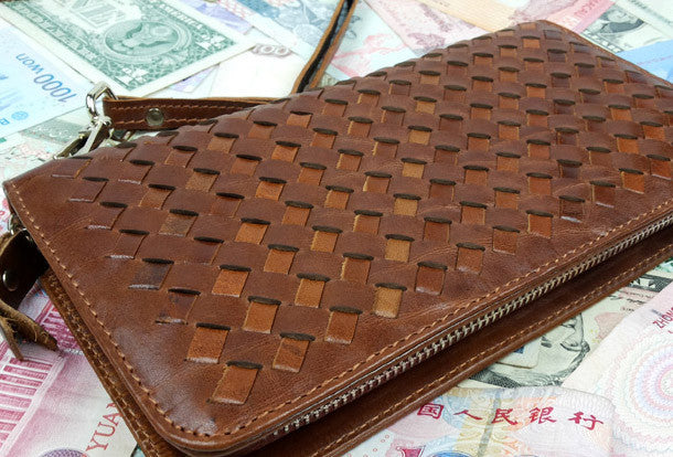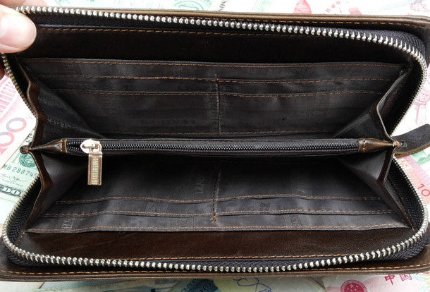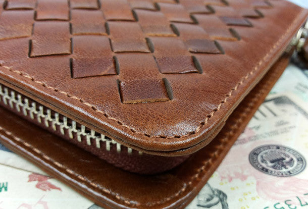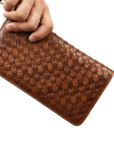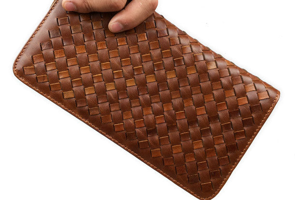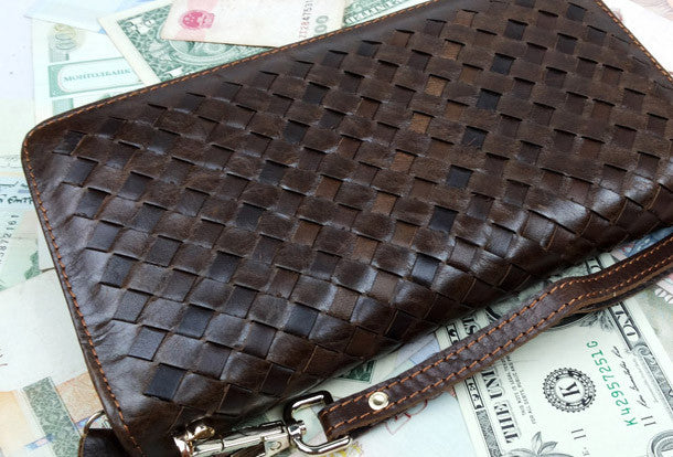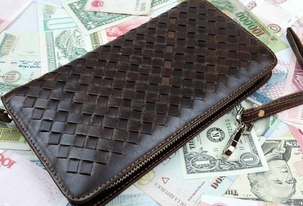 This is Clutch men handmade ?leather Vintage modern brown coffee?weave zip wallet men long wallet purse clutch.The wallet is bifold,color is brown,coffee.There are 2?full size bill slots/holders, 1?zip holders,8 ID/credit card slots/holders,2?side?holders.