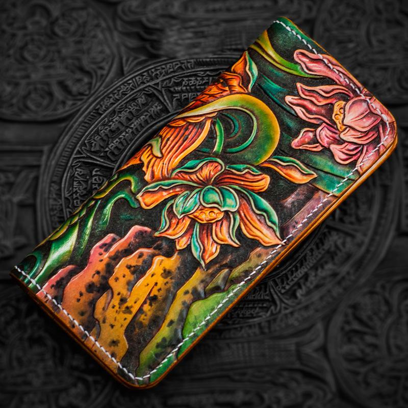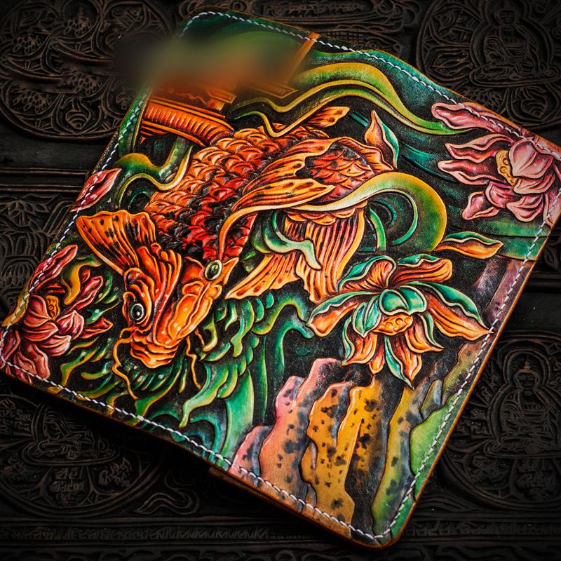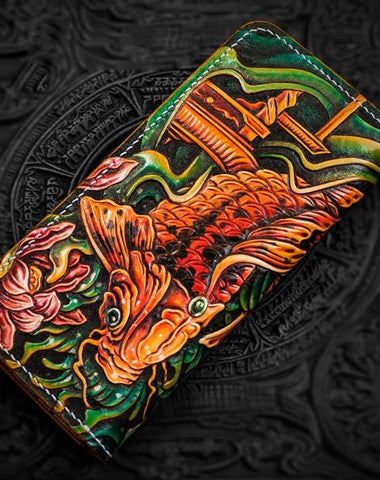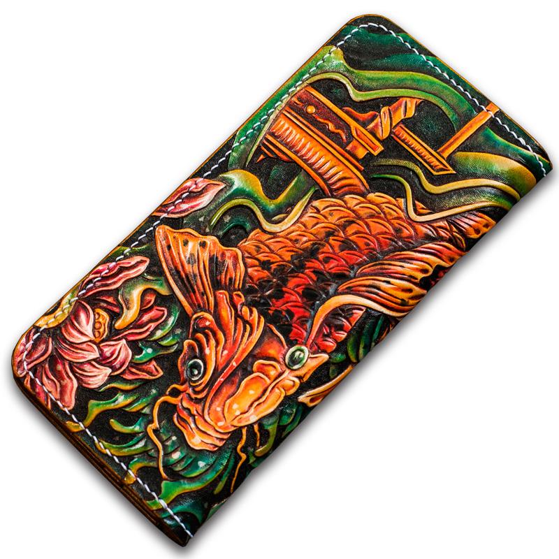 Design: Handmade Leather Men Tooled Carp Cool Leather Wallet Long Phone Wallets for Men