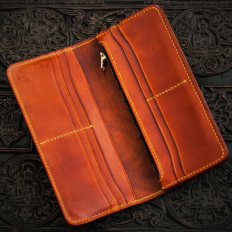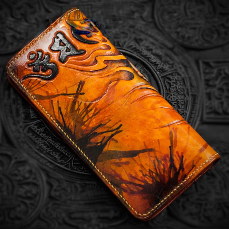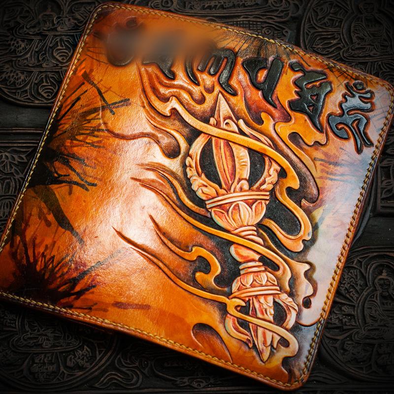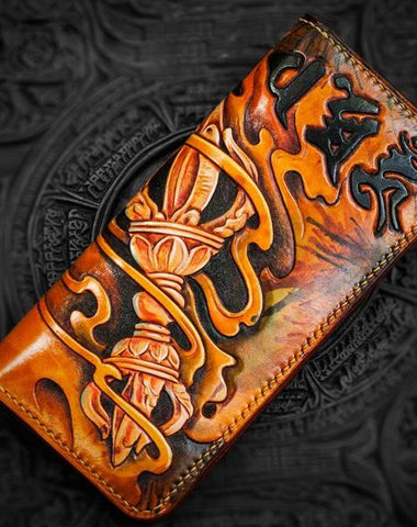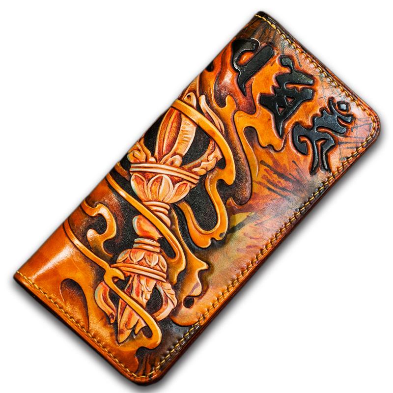 Design: Handmade Leather Men Tooled Tibetan Pestle Cool Leather Wallet Long Phone Wallets for Men