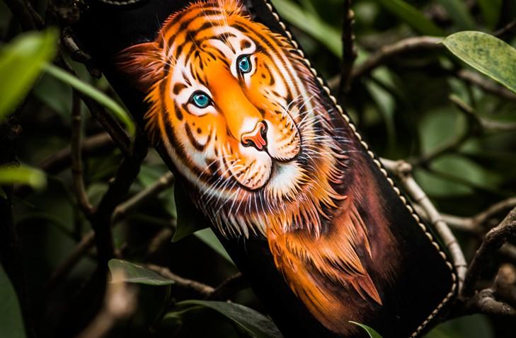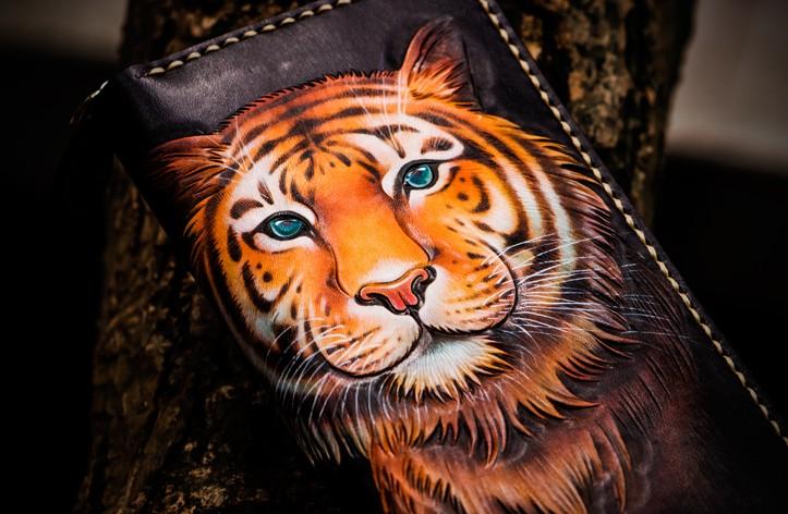 Design: Handmade Leather Men Tooled Tiger Cool Leather Wallet Long Phone Clutch Wallets for Men