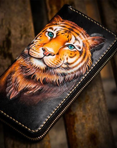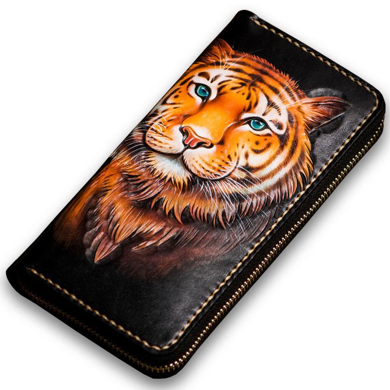 Handmade Leather Men Tooled Tiger Cool Leather Clutch Wallets Long Wallets for Men