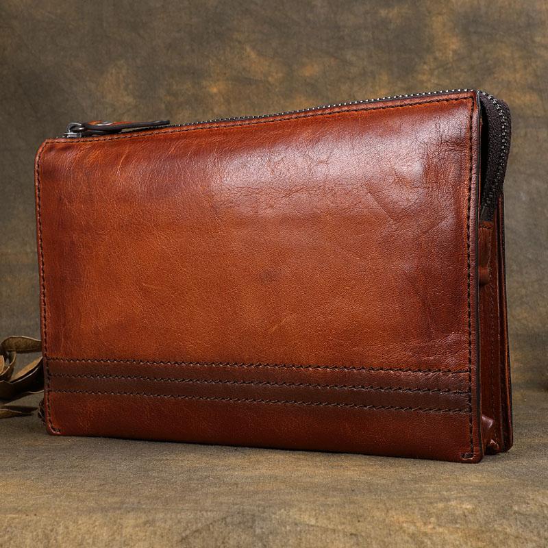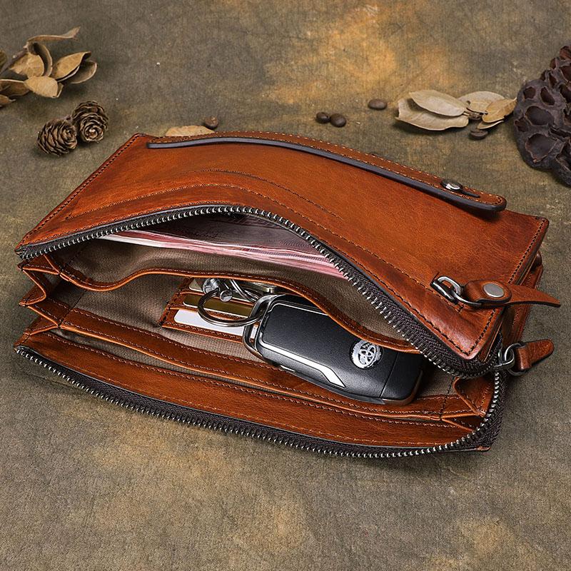 Design: Handmade Leather Mens Brown Long Wallet Multi-function Wristlet Wallet Black Zipper Clutch Wallet for Men