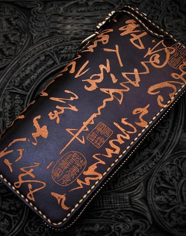 Design: Handmade Leather Mens Chain Chinese Handwriting Biker Wallet Cool Leather Wallet Long Phone Wallets for Men