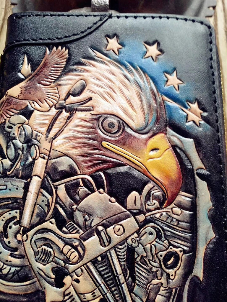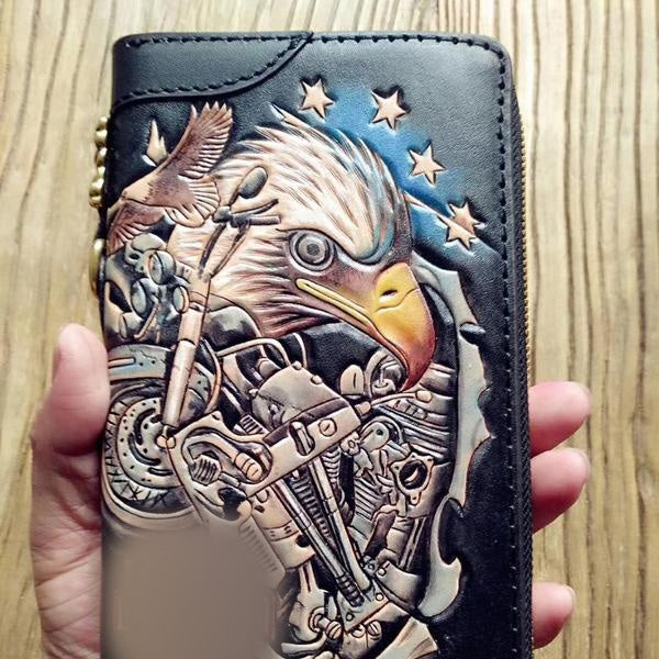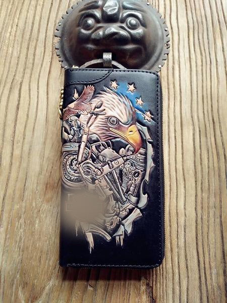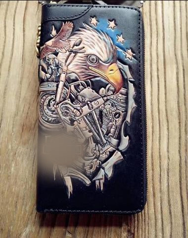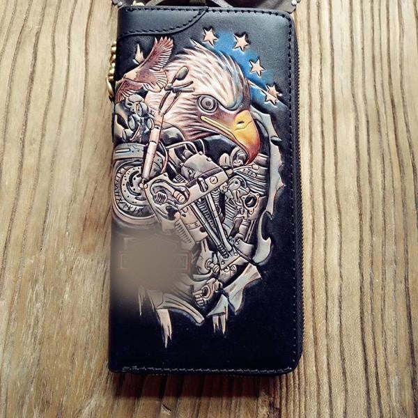 Style: Handmade Leather Mens Clutch Wallet Cool Eagle Tooled Chain Wallet Biker Wallets for Men