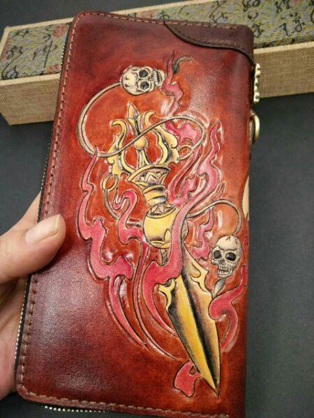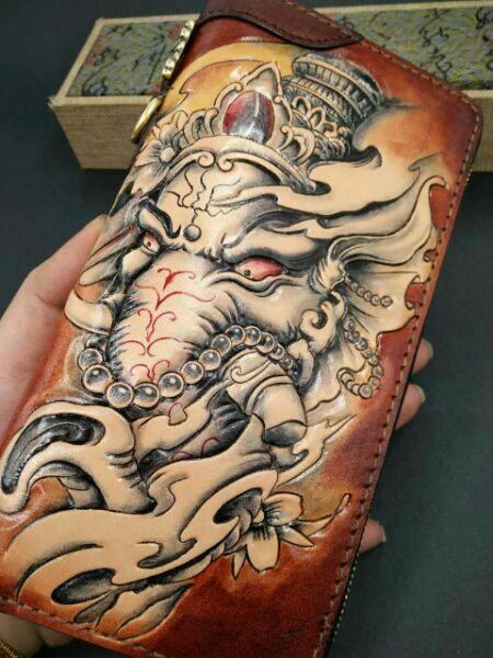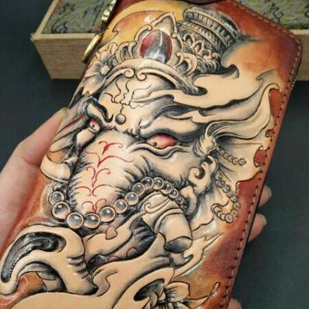 Design: Handmade Leather Mens Clutch Wallet Cool GANESHA Tooled Chain Wallet Biker Wallets for Men
