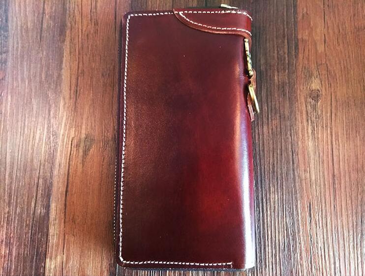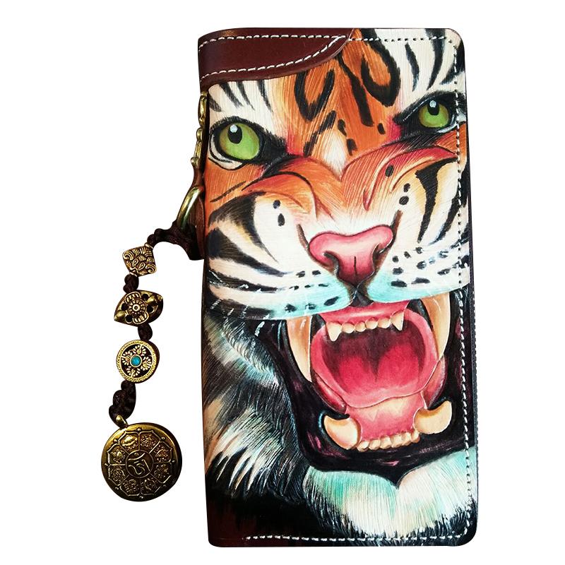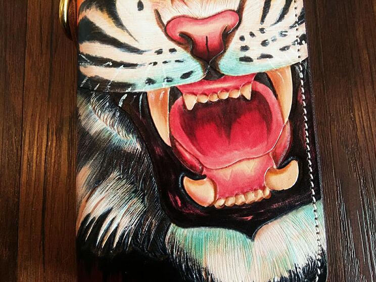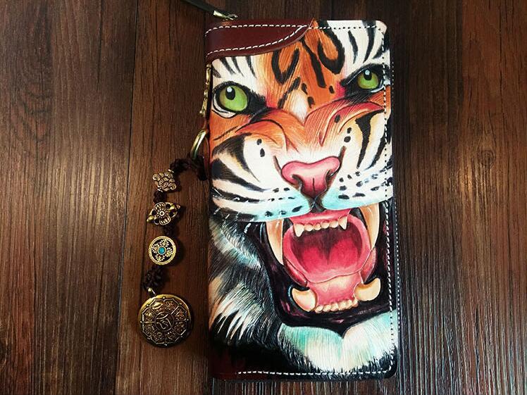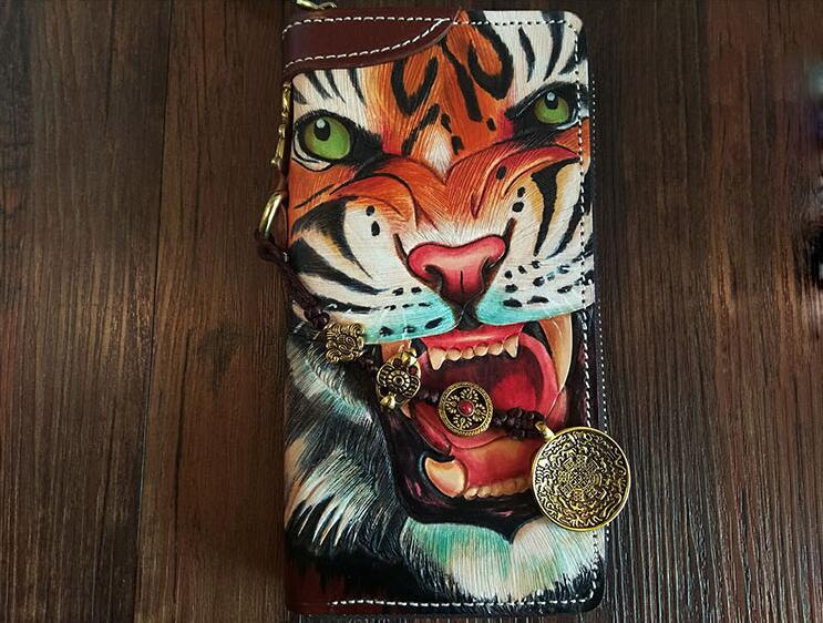 Design: Handmade Leather Mens Clutch Wallet Cool Tiger Tooled Chain Wallet Biker Wallets for Men