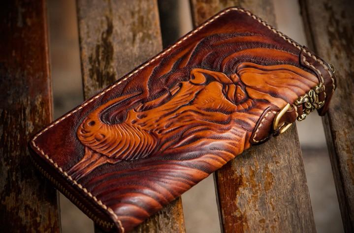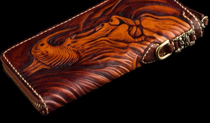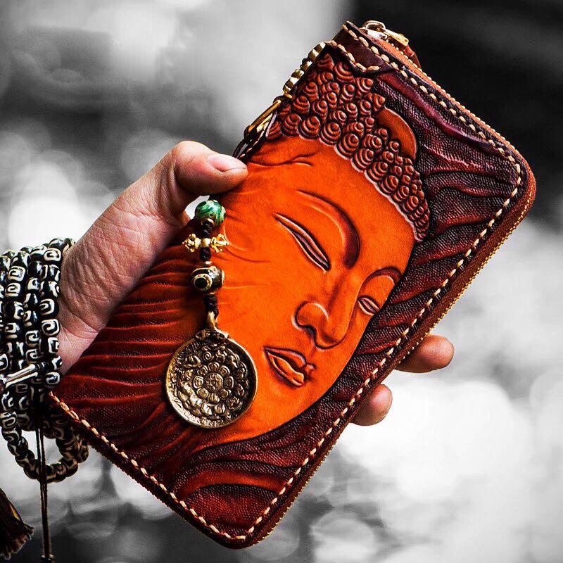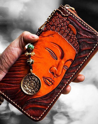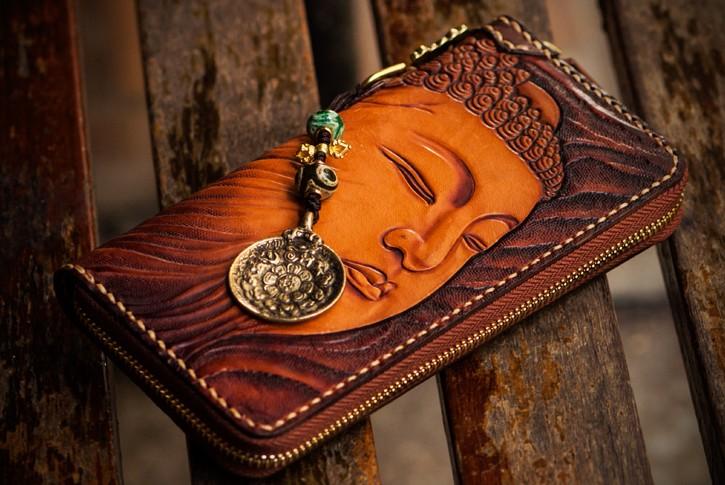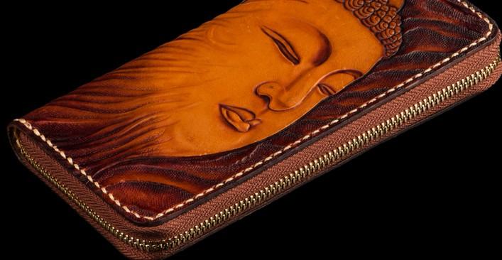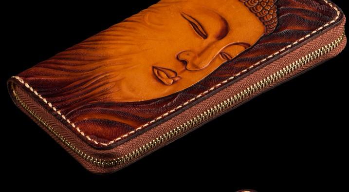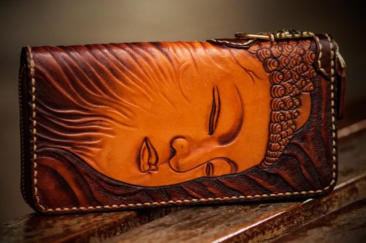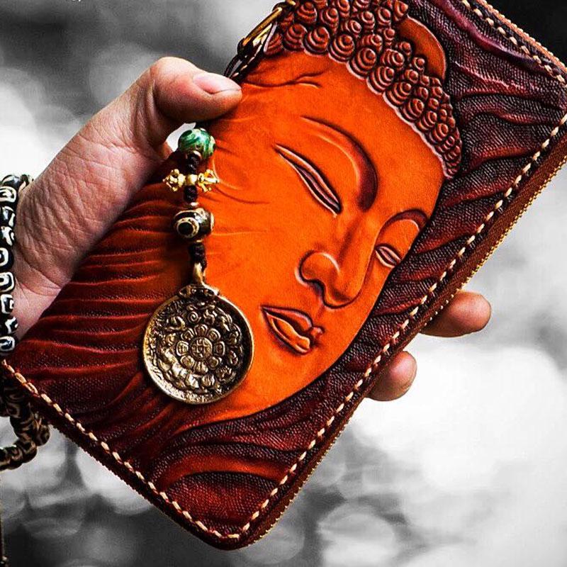 Design: Handmade Leather Mens Tooled Buddha&Demon Chain Biker Wallet Cool Leather Wallet Long Clutch Wallets for Men