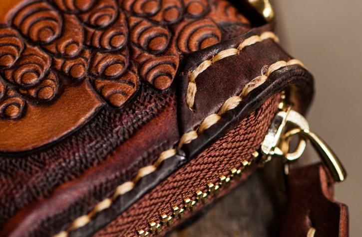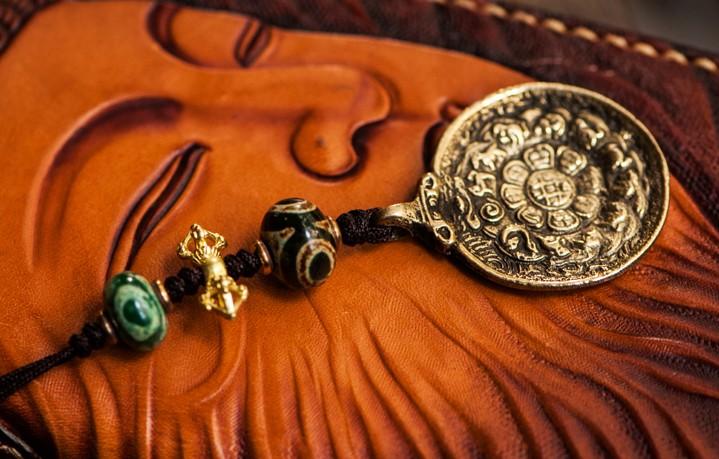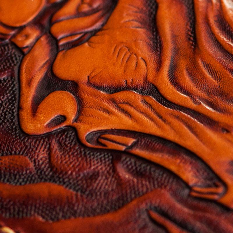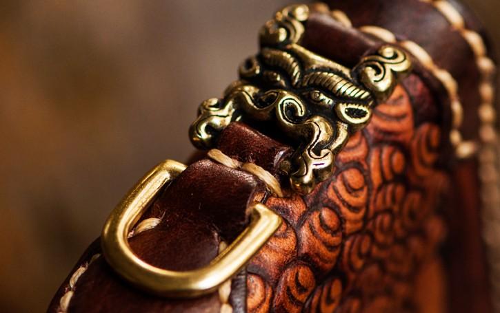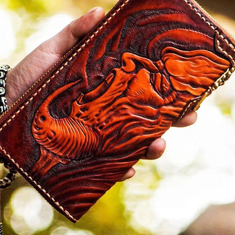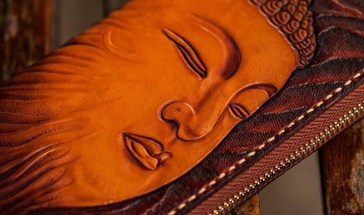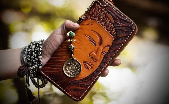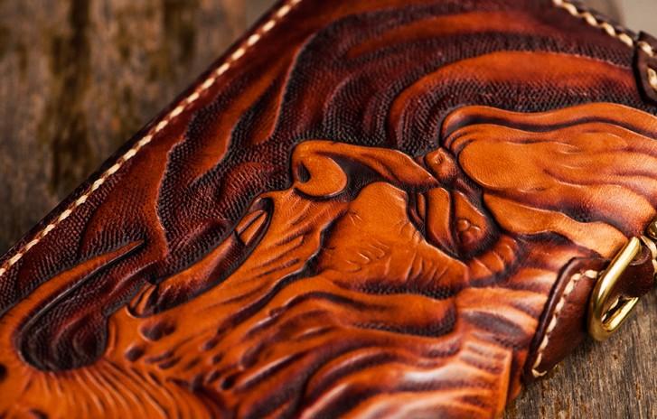 Design: Handmade Leather Mens Tooled Buddha&Demon Chain Biker Wallet Cool Leather Wallet Long Clutch Wallets for Men
