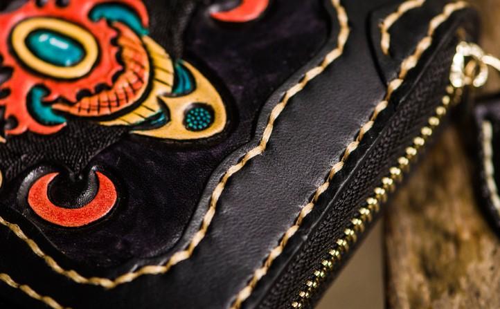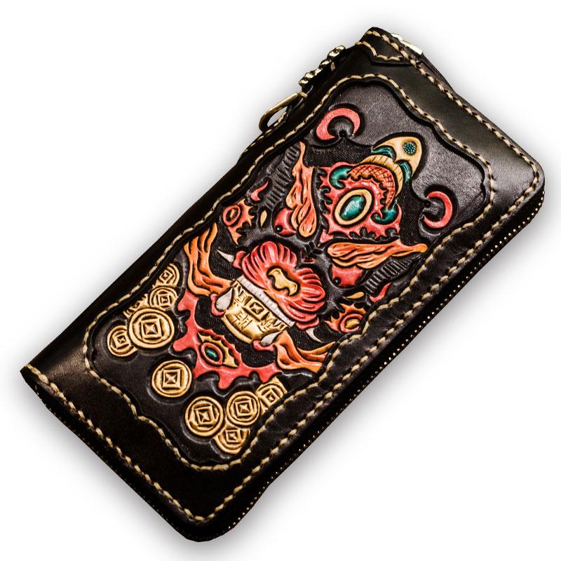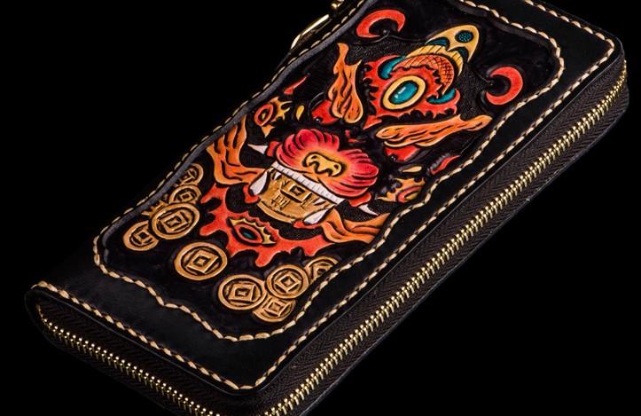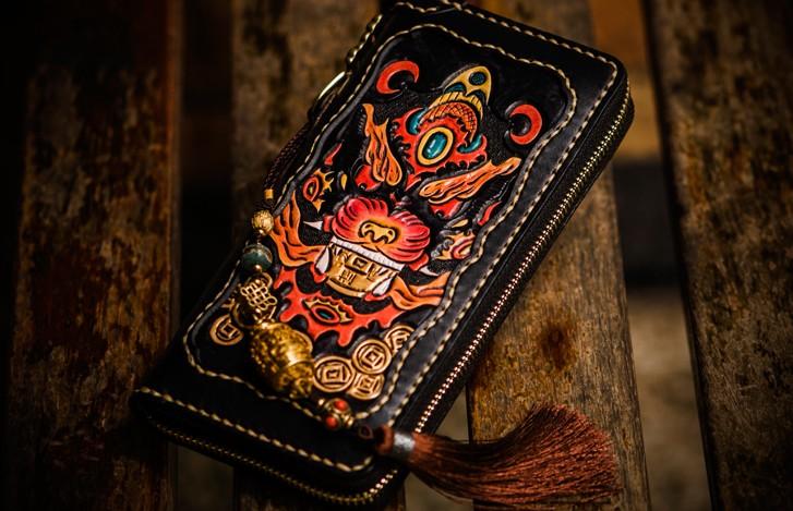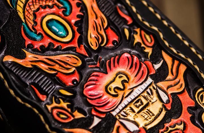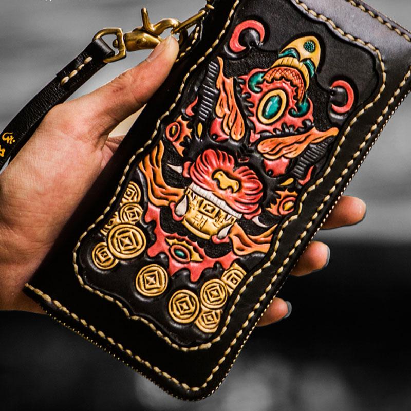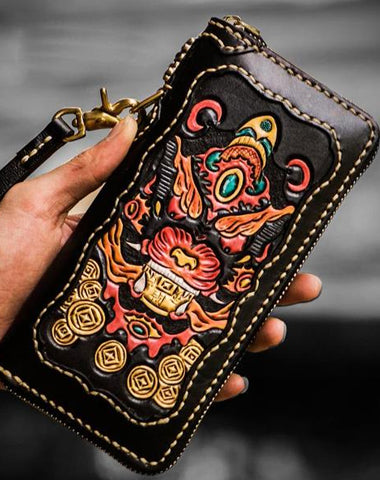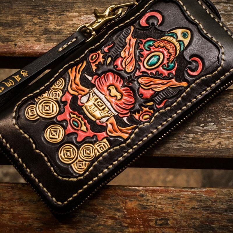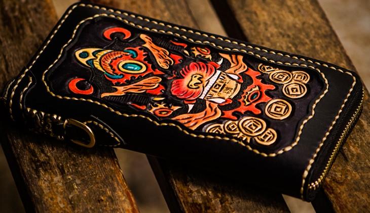 Design: Handmade Leather Mens Tooled Monster Chain Biker Wallet Cool Leather Wallet Long Clutch Wallets for Men