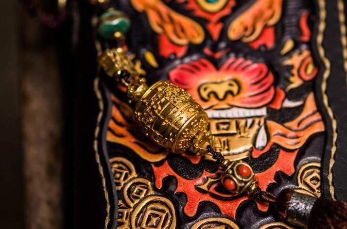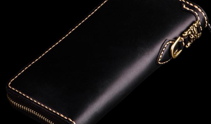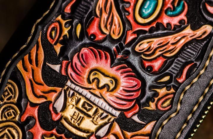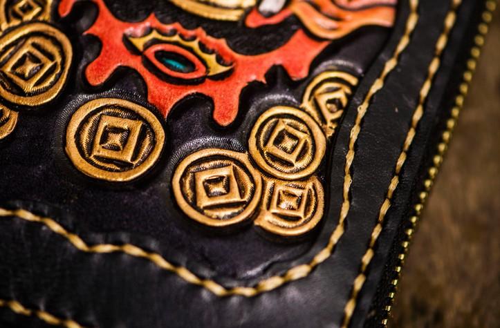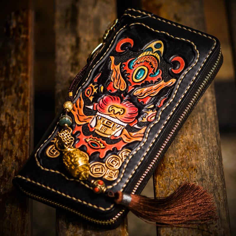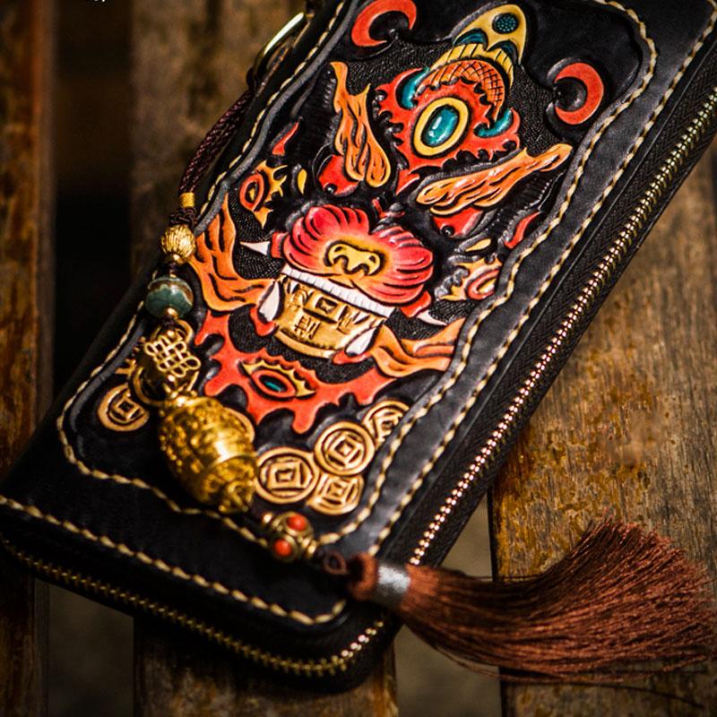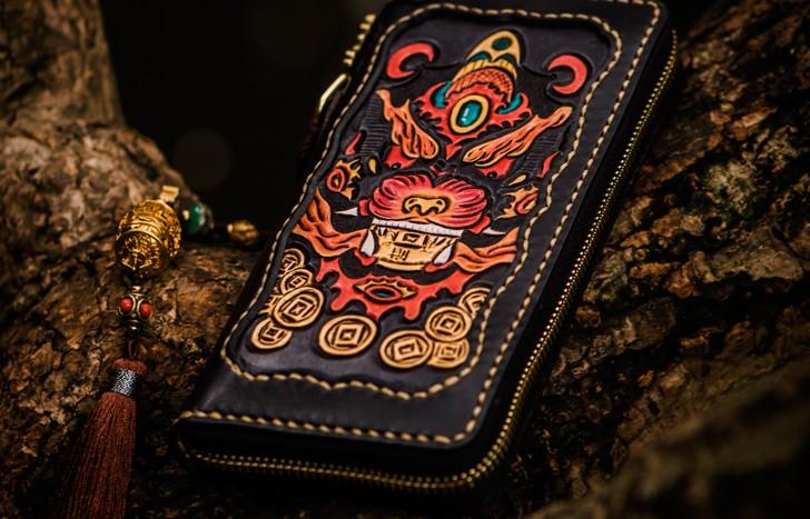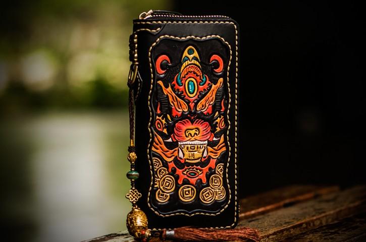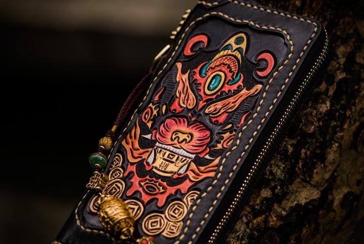 Design: Handmade Leather Mens Tooled Monster Chain Biker Wallet Cool Leather Wallet Long Clutch Wallets for Men