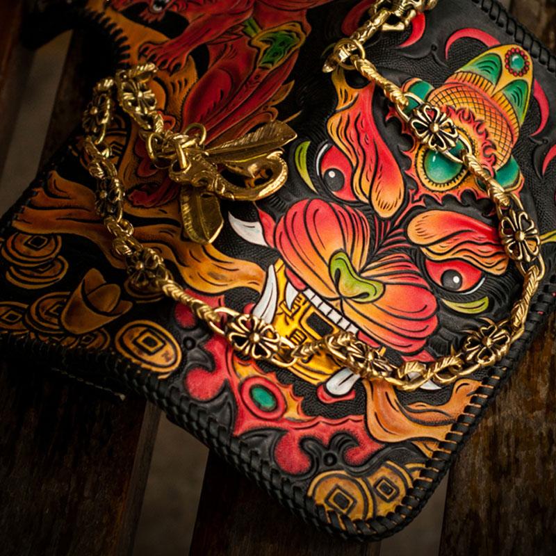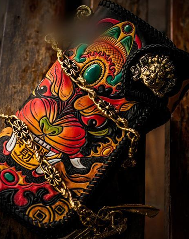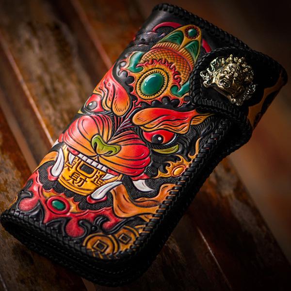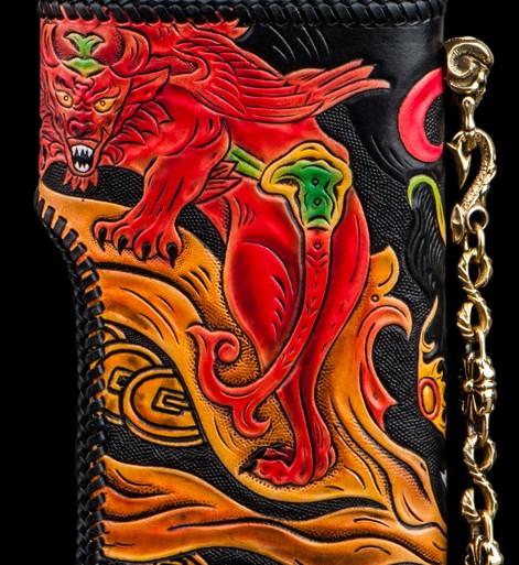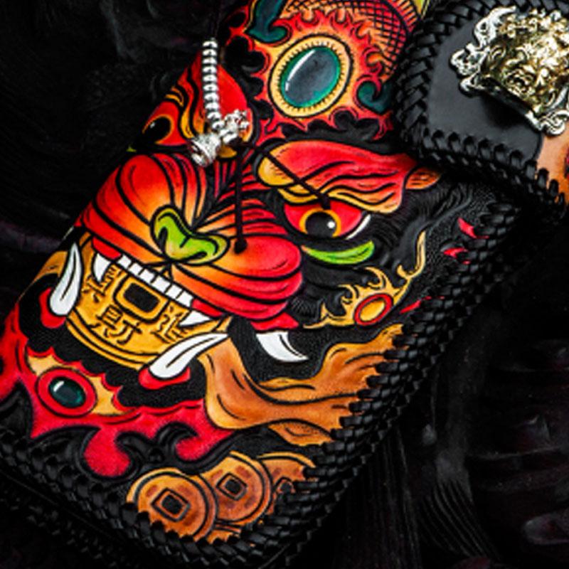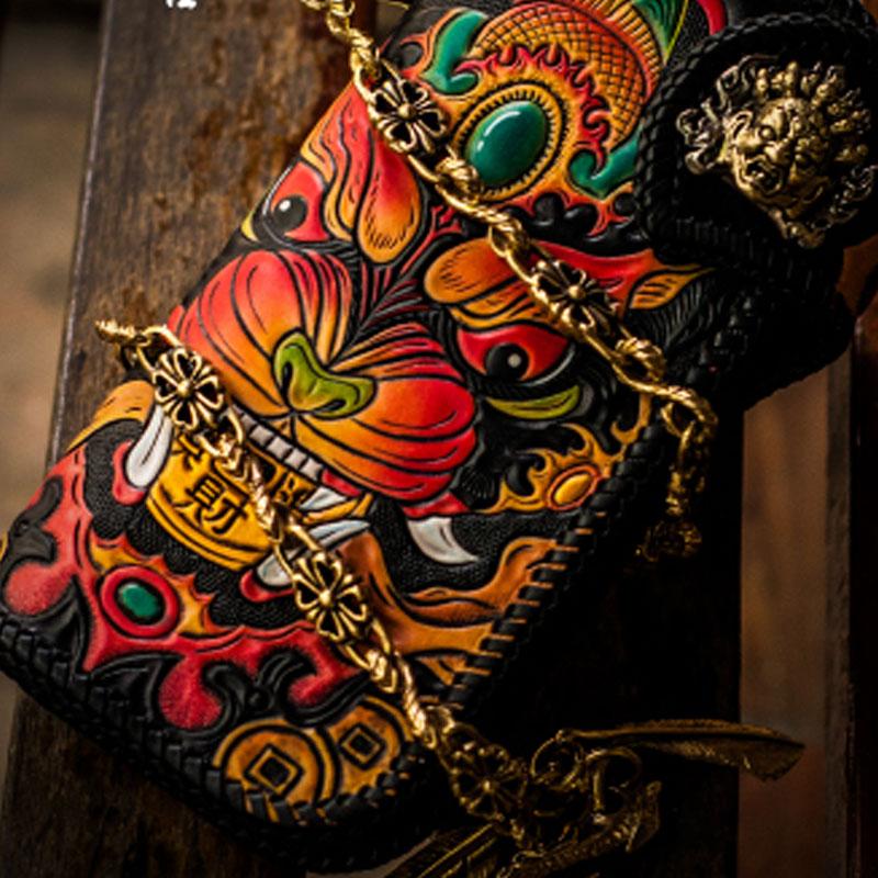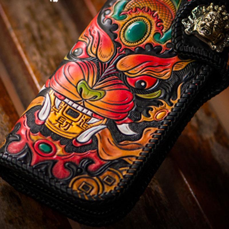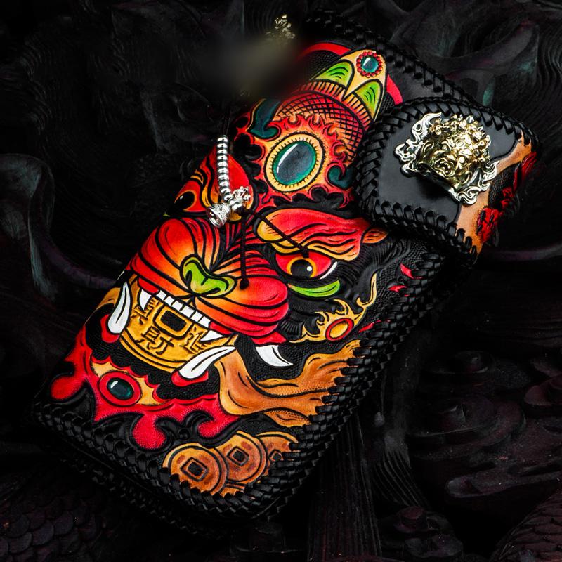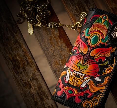 Handmade Leather Monster Mens Chain Biker Wallets Cool Tooled Leather Wallet Long Wallets for Men
