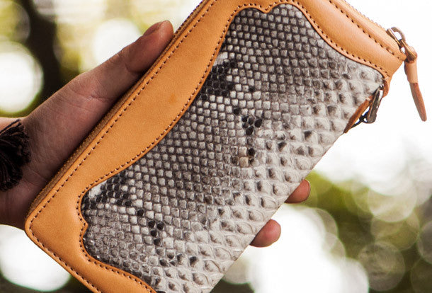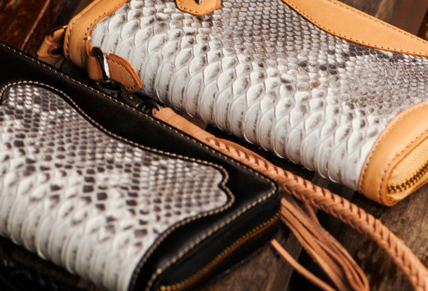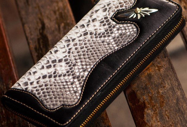 Design: Brown?Carved Tooled ?python skin biker Clutch zip Leather Wallet