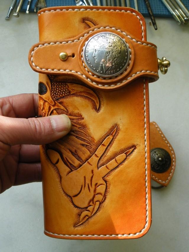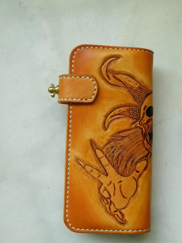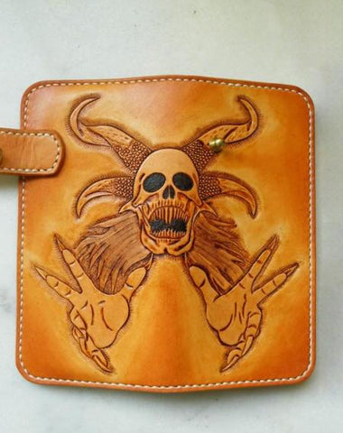 Design: Handmade Leather Skull Devil Mens Chain Wallet Biker Wallet Cool Leather Wallet Long Tooled Wallets for Men