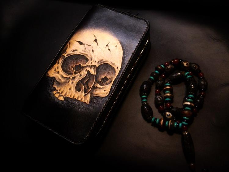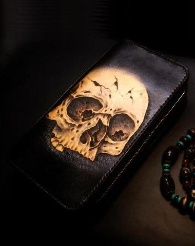 Design: Handmade Leather Skull Double Zipper Mens Long Wallet Biker Wallet Cool Leather Wallet Long Tooled Wallets for Men
