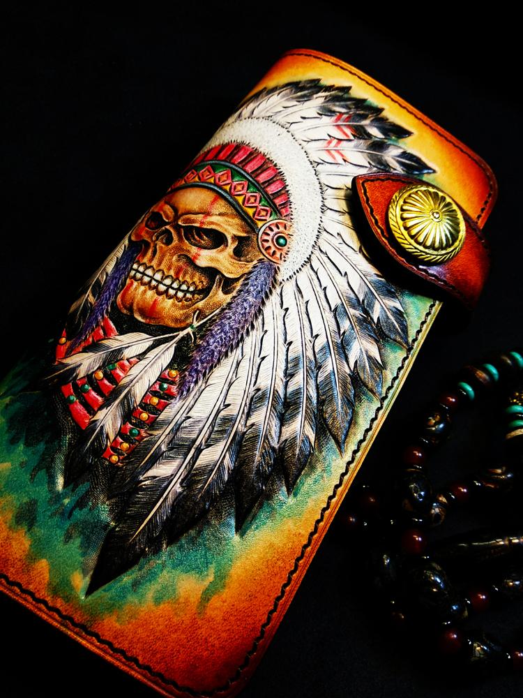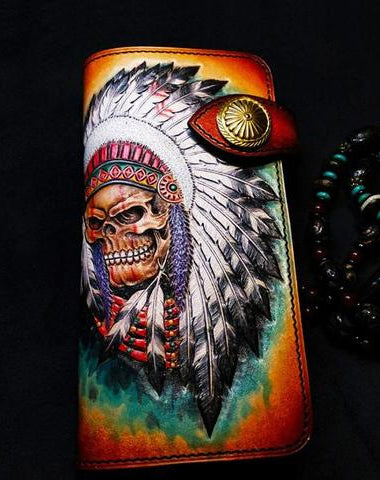 Design: Handmade Leather Skull Indian Mens Chain Wallet Biker Wallet Cool Leather Wallet Long Tooled Wallets for Men