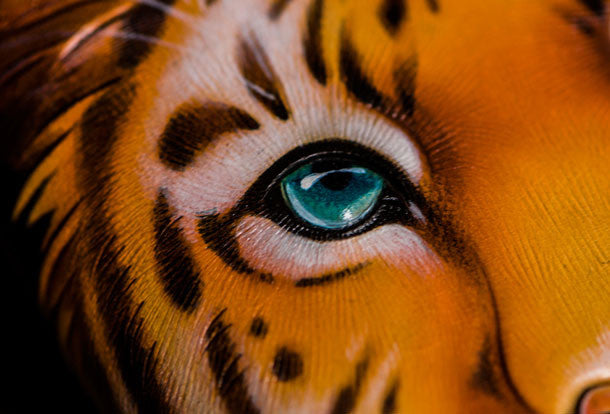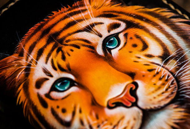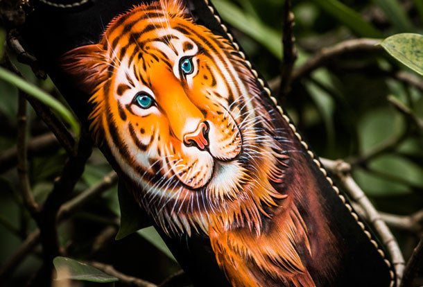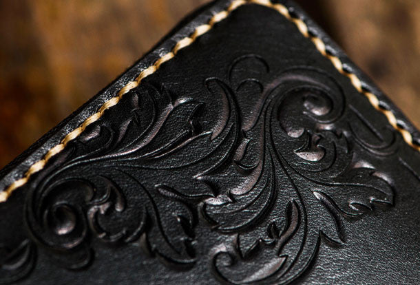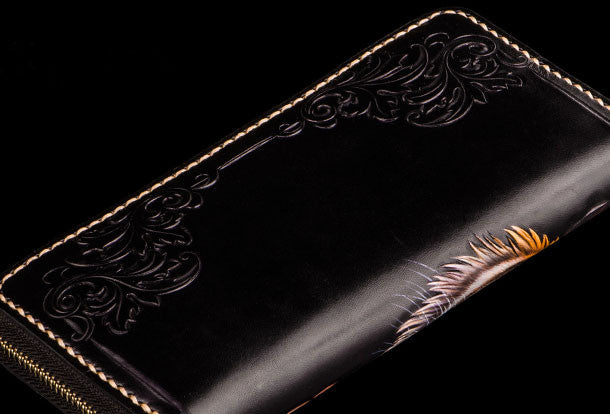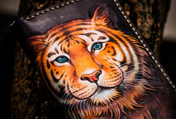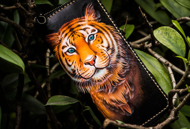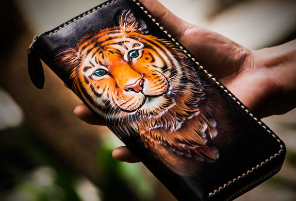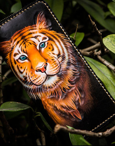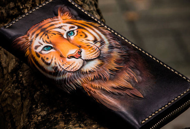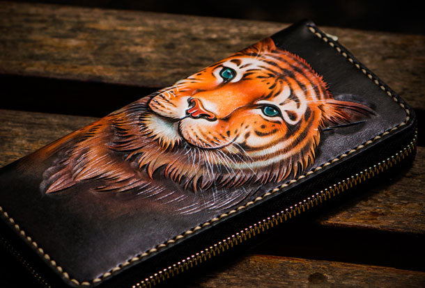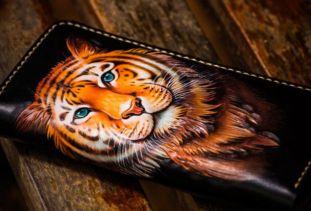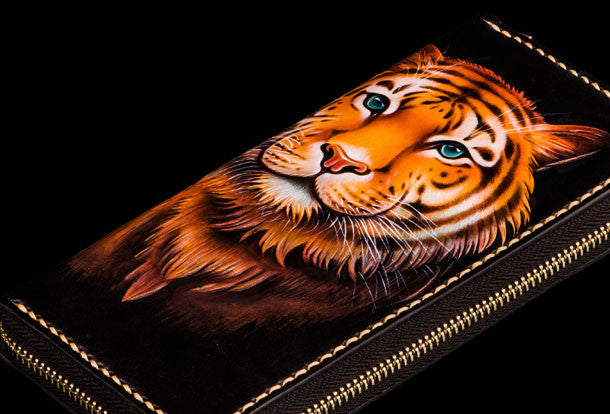 Design: Black Carved Tooled tiger? biker Clutch zip Leather Wallet
