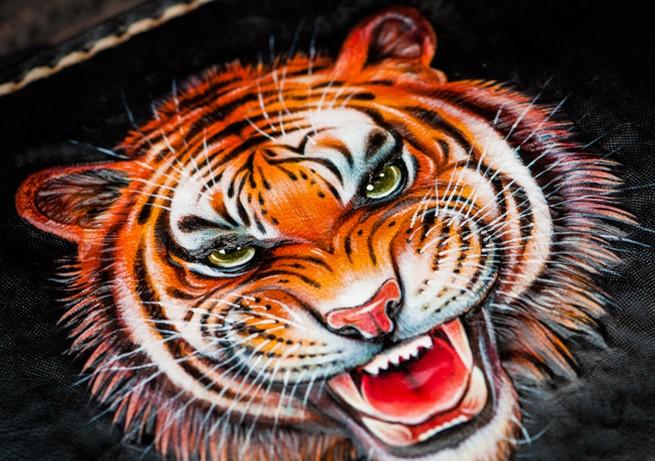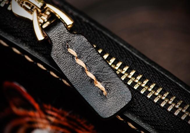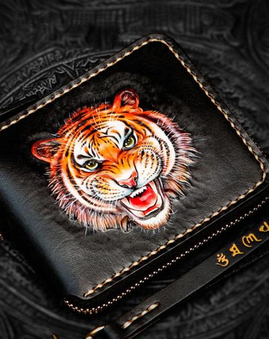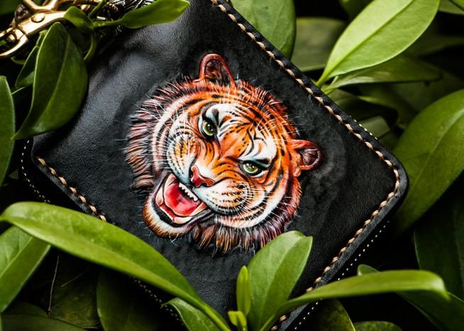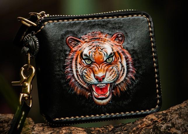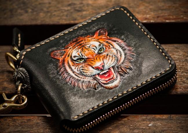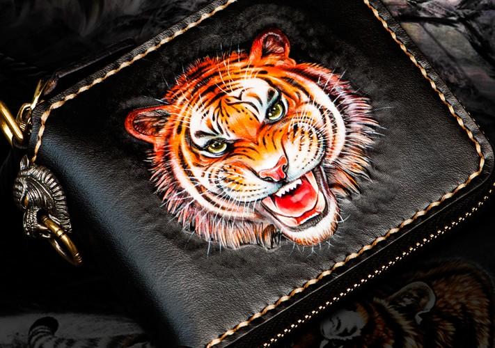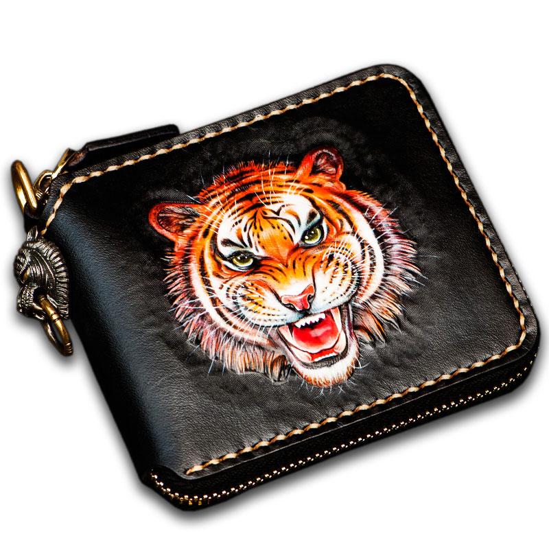 Design: Handmade Leather Tiger Tooled Mens billfold Wallet Cool Clutch Wristlet Bag Chain Wallet Biker Wallet for Men