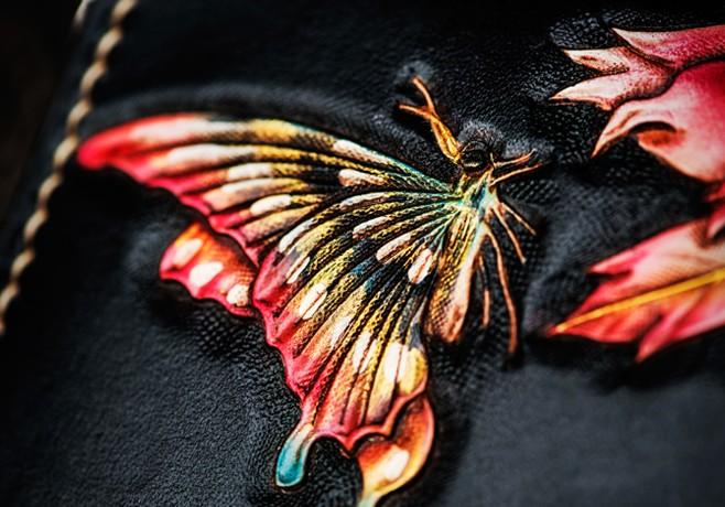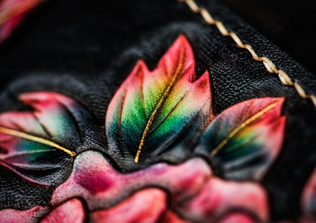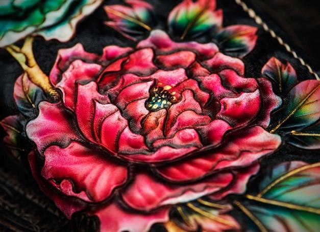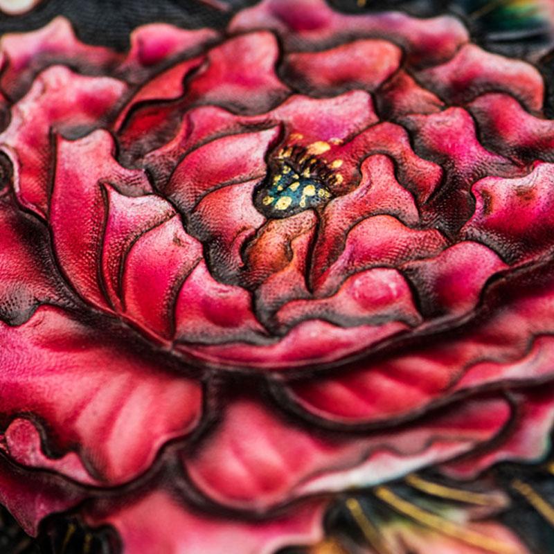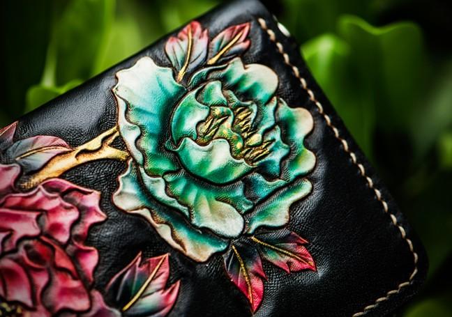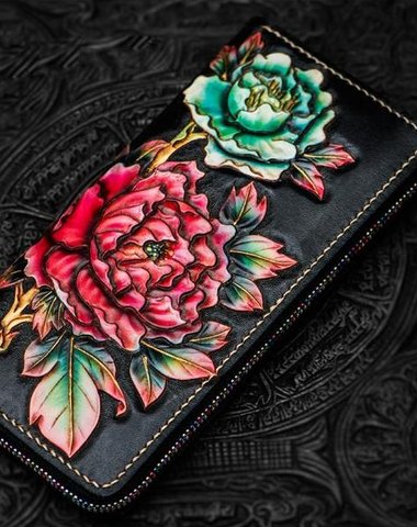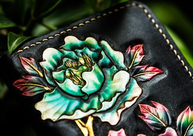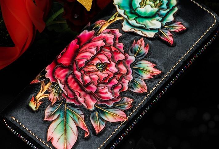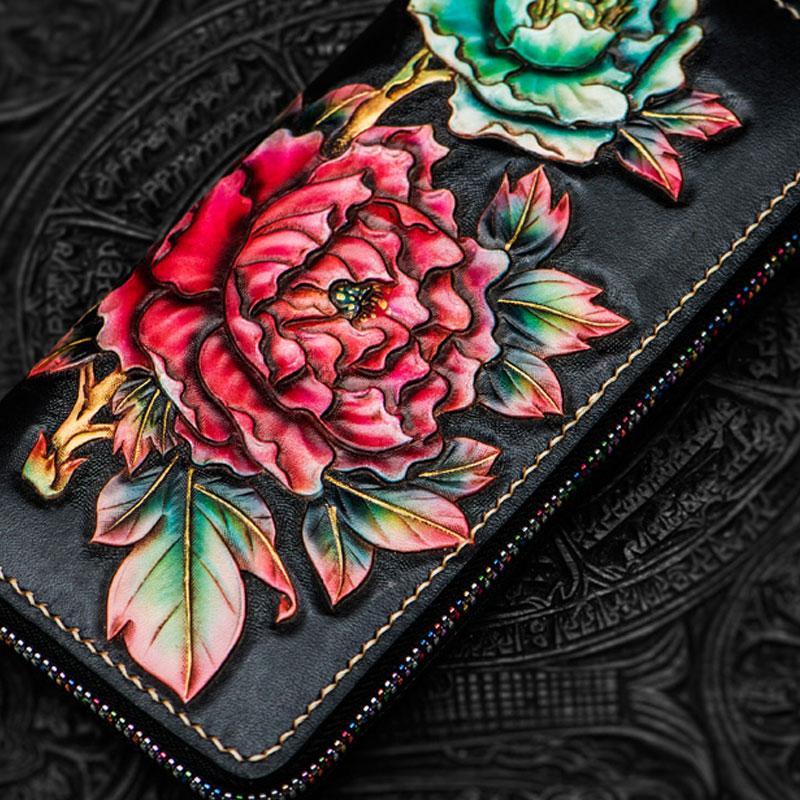 Design: Handmade Leather Tooled Black Peony Cool Leather Wallet Zipper Long Phone Clutch Wallets for Women