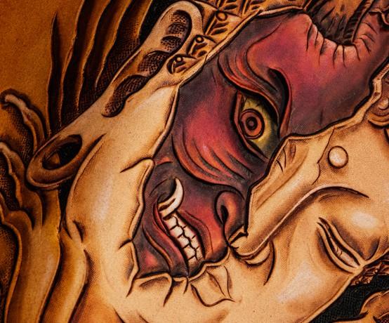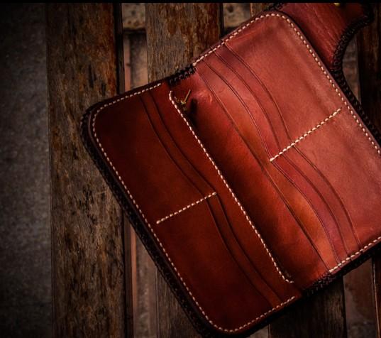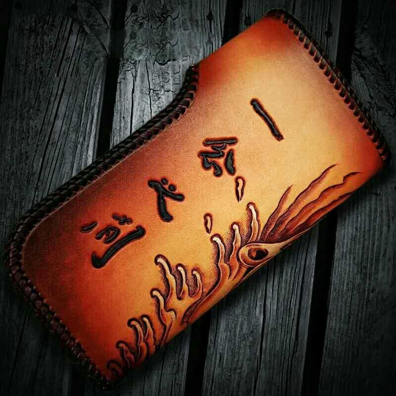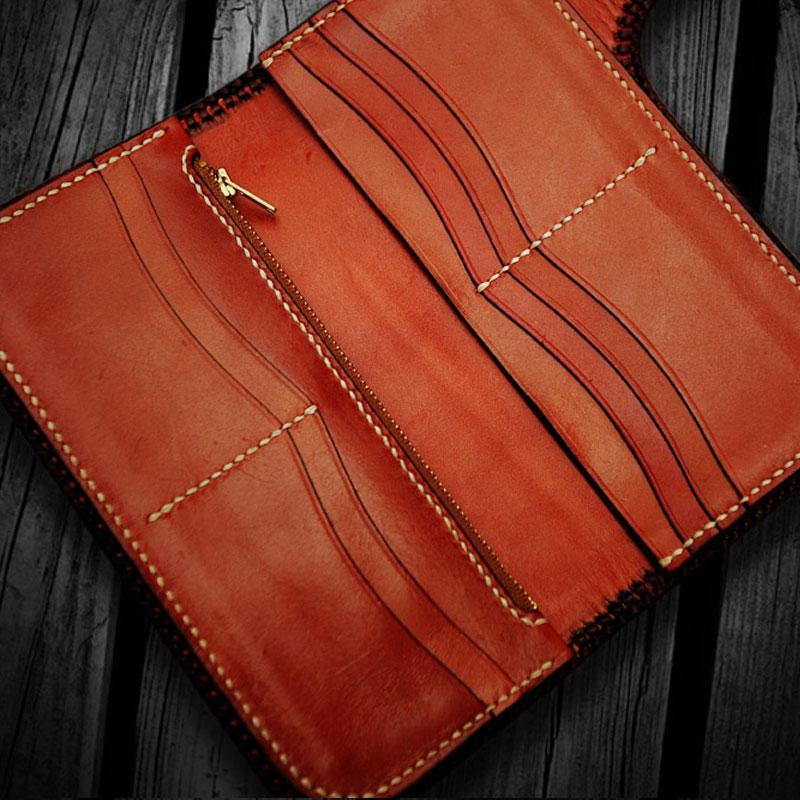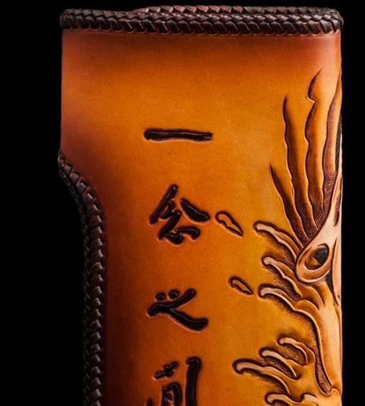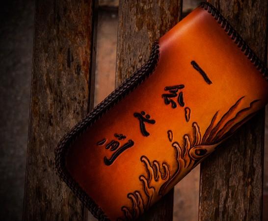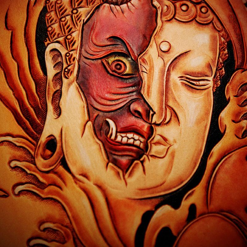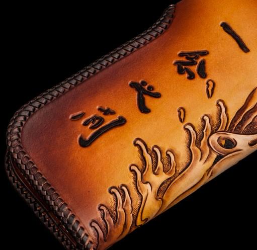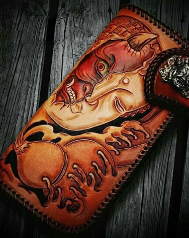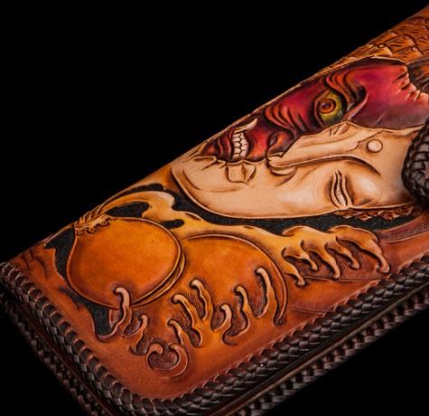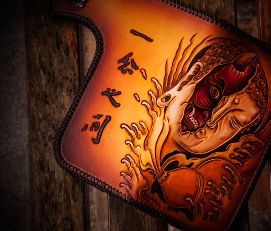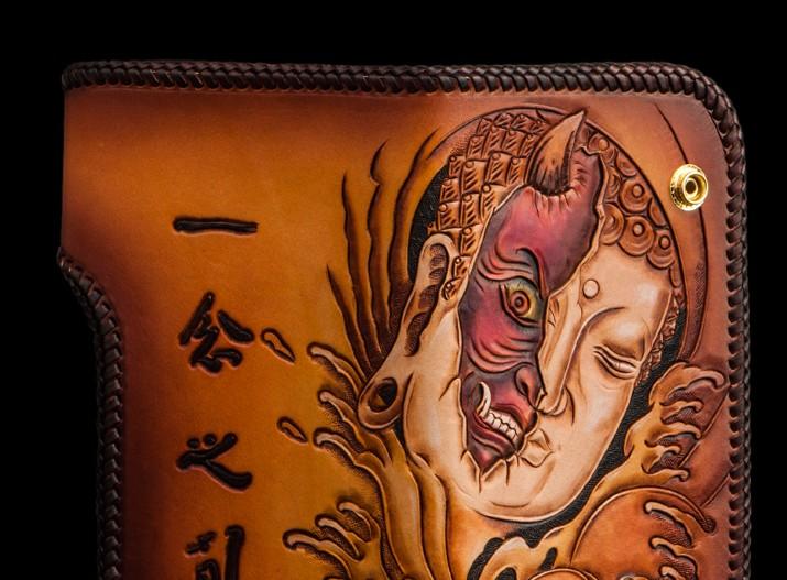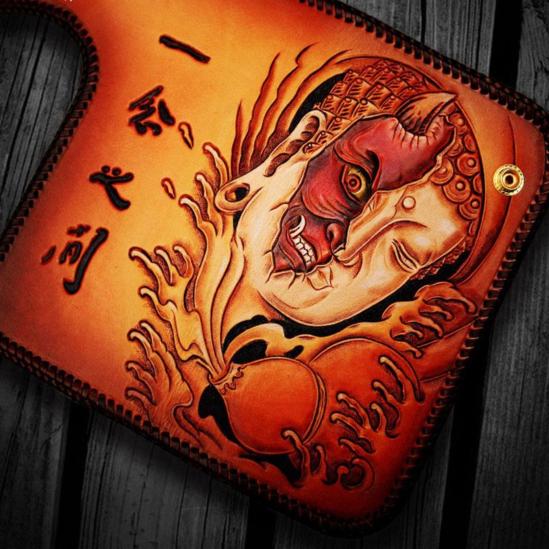 Design: Handmade Leather Tooled Buddha&Demon Mens Chain Biker Wallet Cool Leather Wallet With Chain Wallets for Men