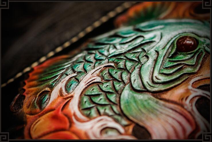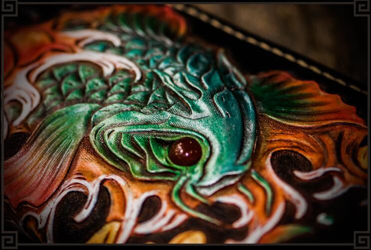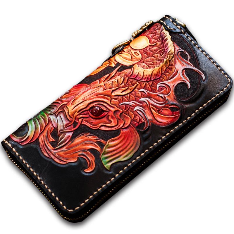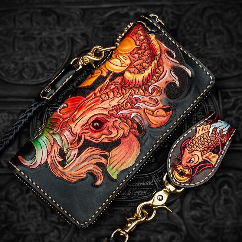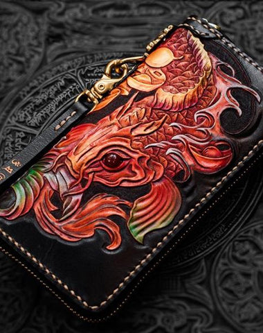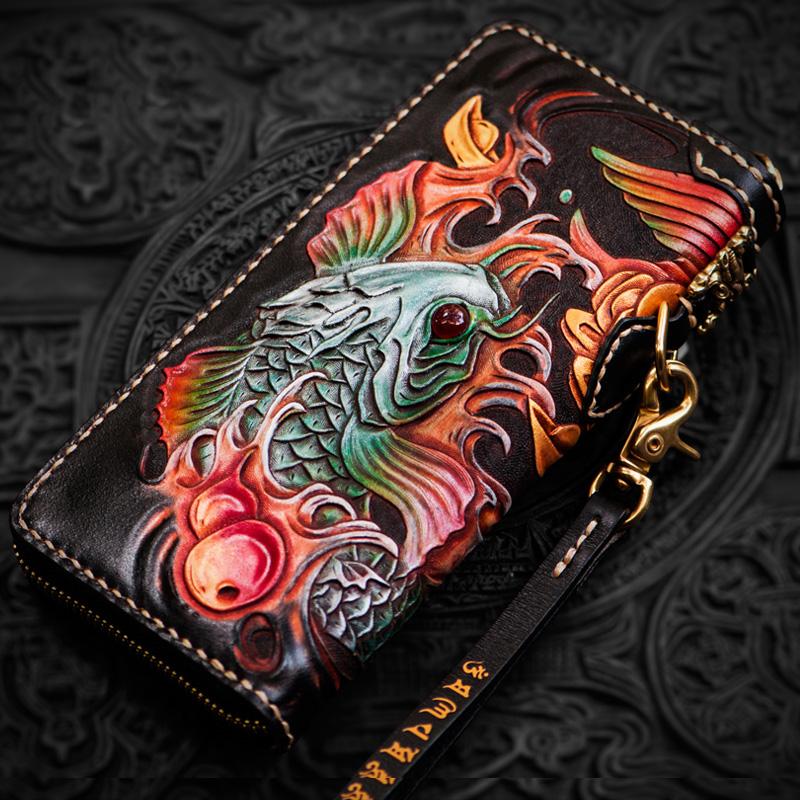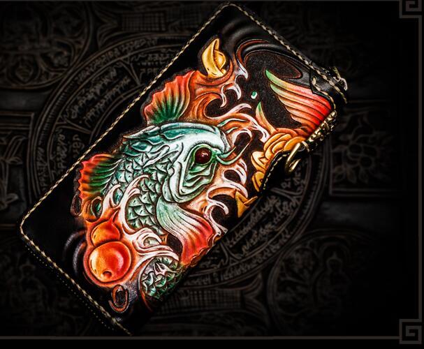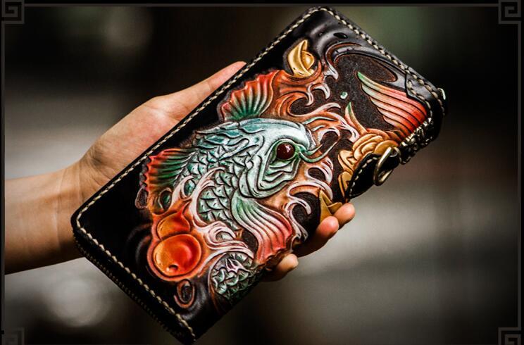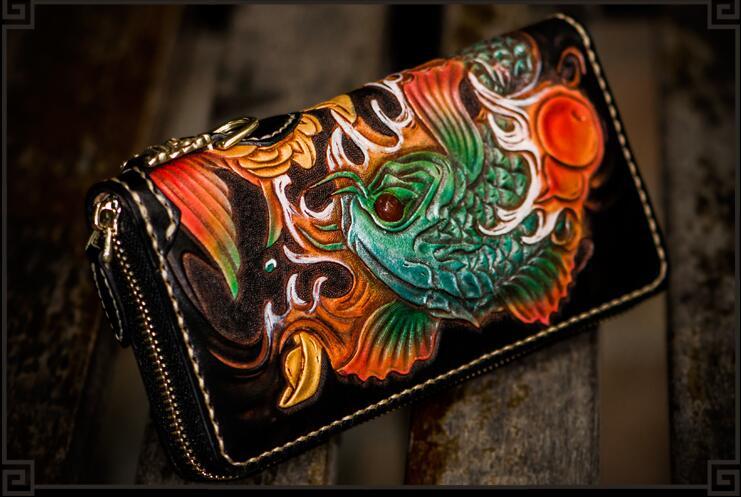Design: Handmade Leather Tooled Carp Mens Chain Biker Wallet Cool Leather Wallet Long Phone Wallets for Men