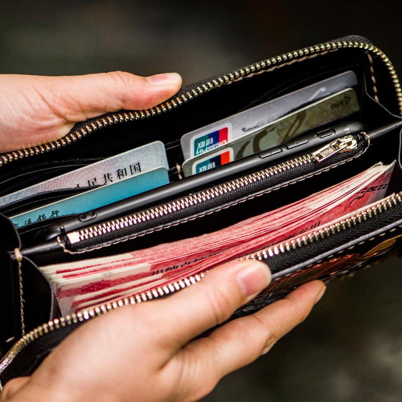 Slots: 2 full size bill slot, 8 card holders, 1 zipper slot, 2 phone slot