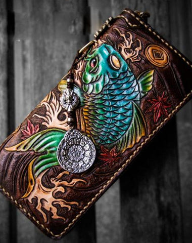 Design: Handmade Leather Tooled Carp Mens Chain Biker Wallet Cool Leather Wallet Long Phone Wallets for Men