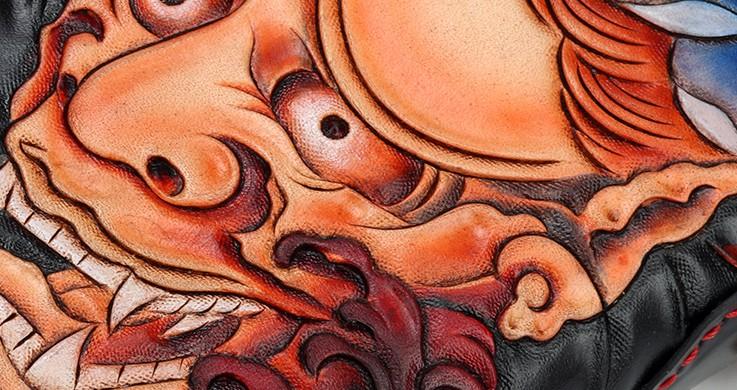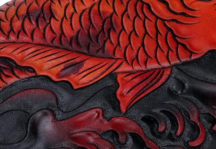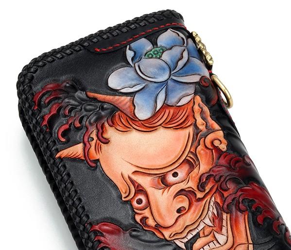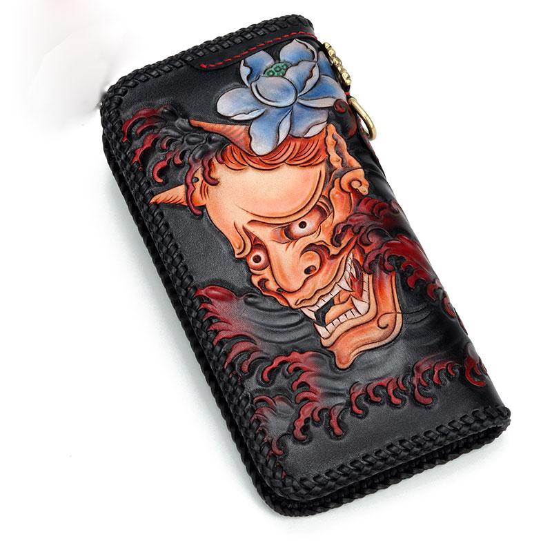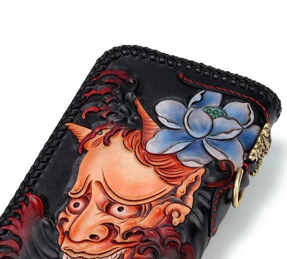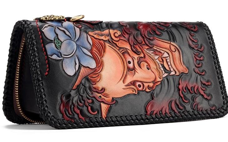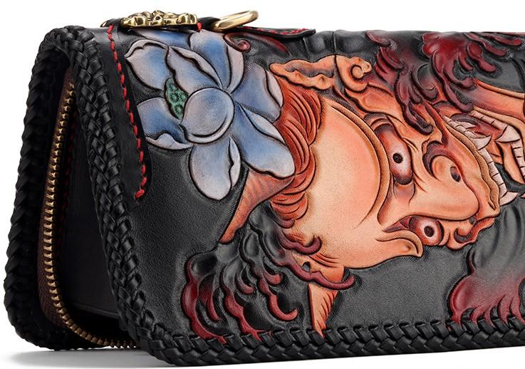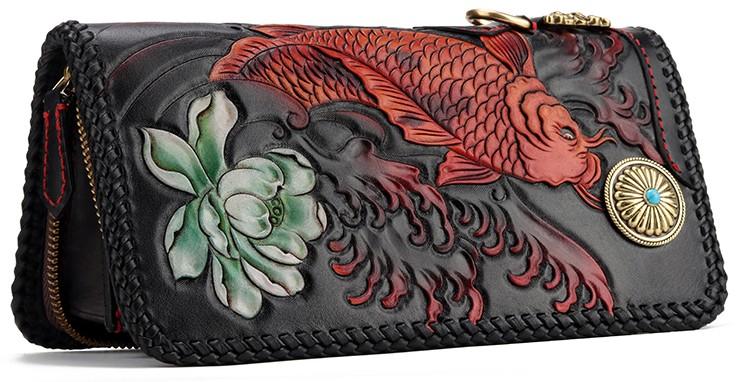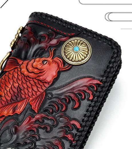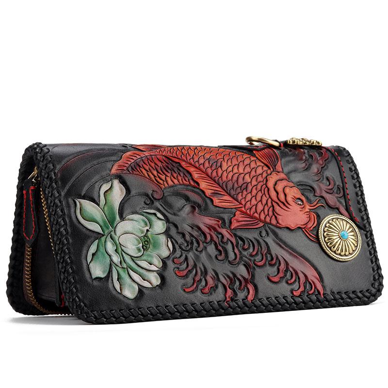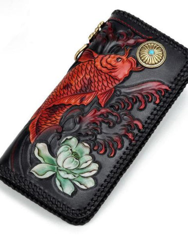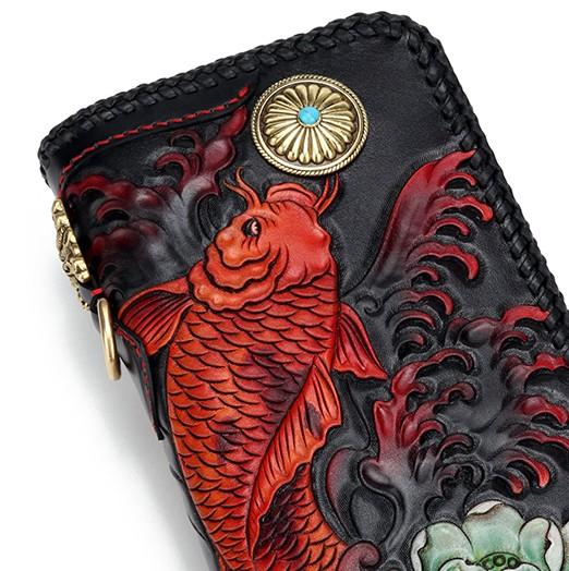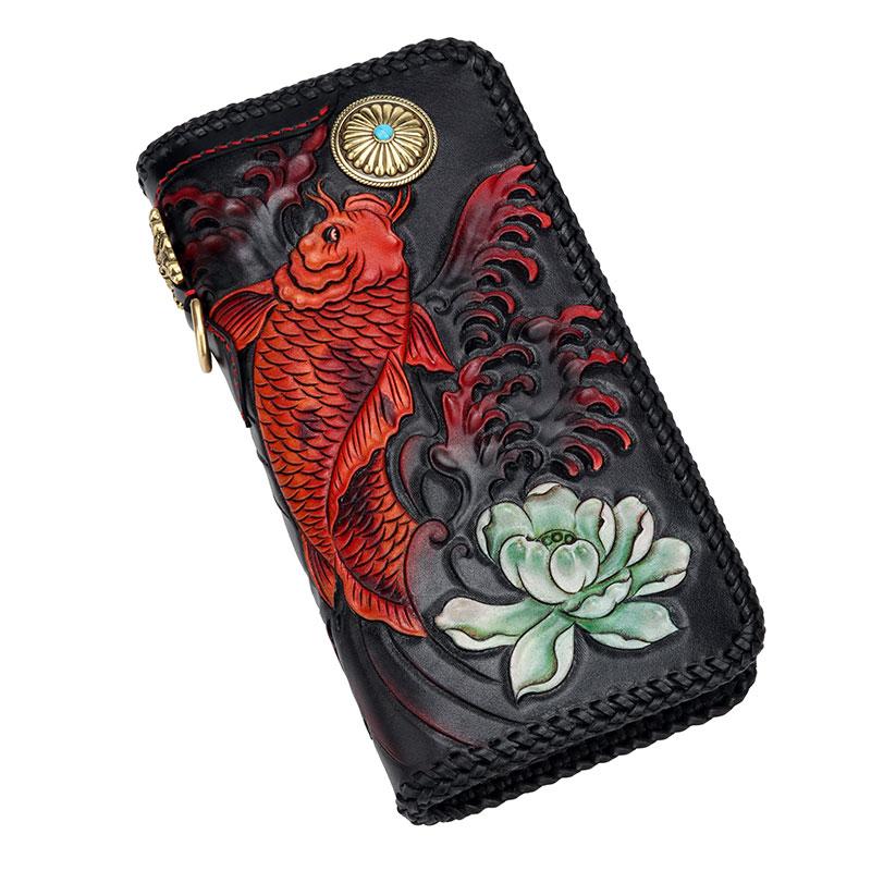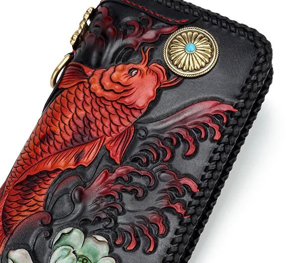 Design: Handmade Leather Tooled Carp Prajna Mens Chain Biker Wallet Cool Leather Wallet Zipper Long Phone Wallets for Men