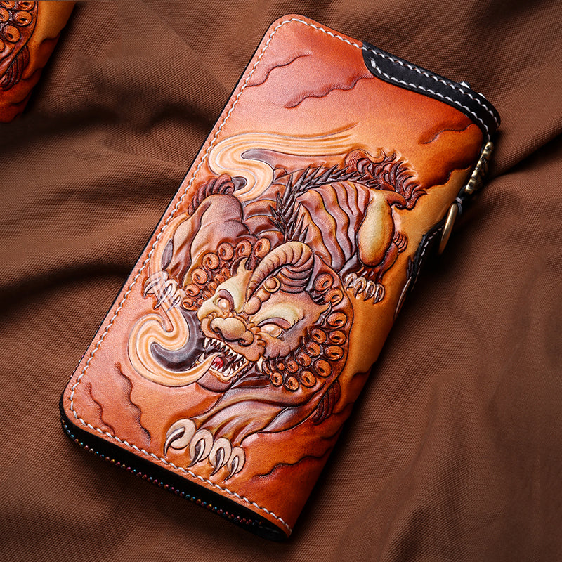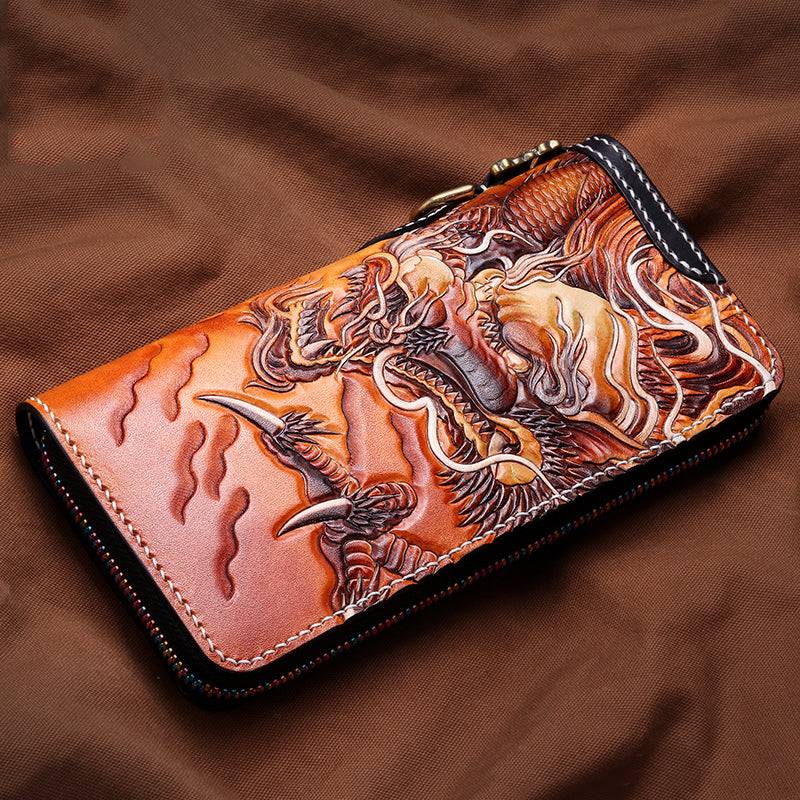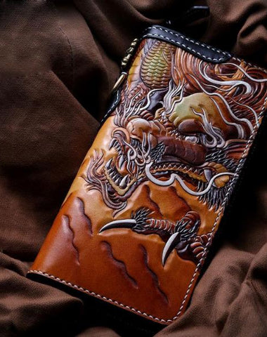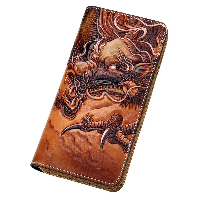 Design: Handmade Leather Tooled Chinese Dragon Tiger Mens Chain Biker Wallet Cool Leather Wallet Zipper Long Phone Wallets for Men