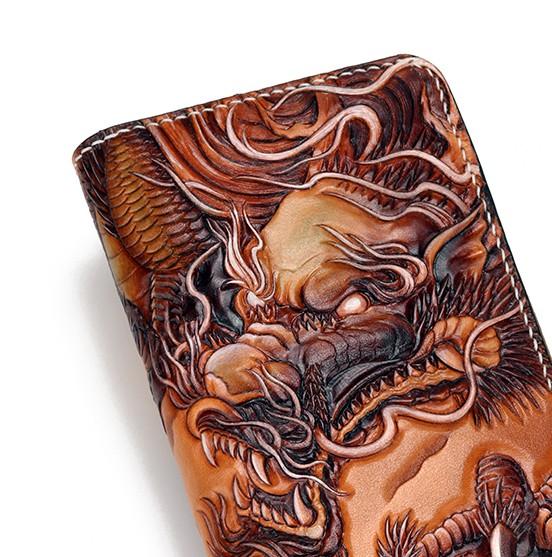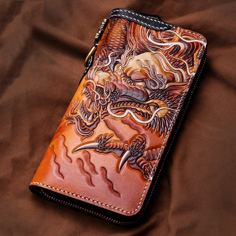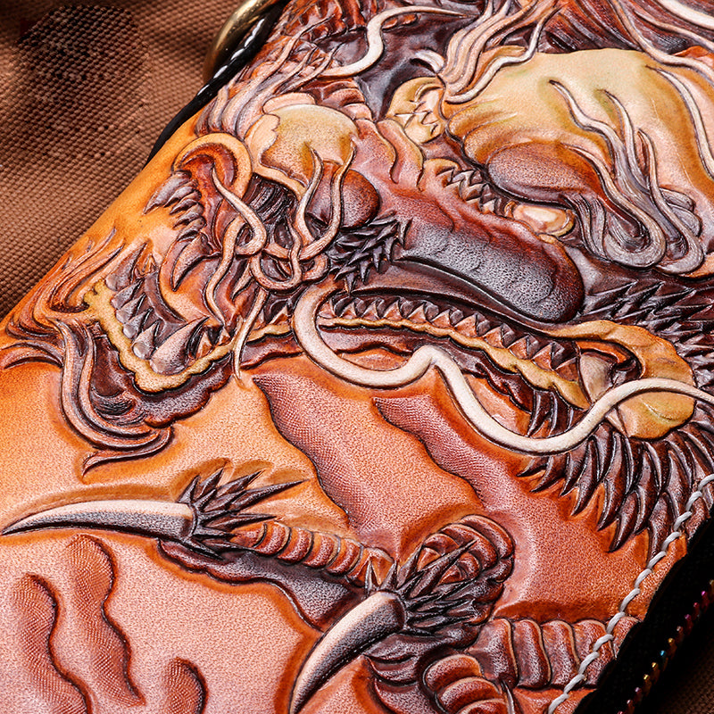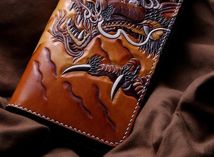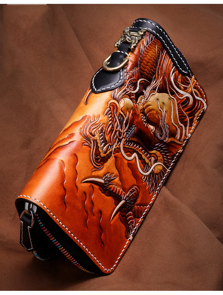 Style: Handmade Leather Tooled Chinese Dragon Tiger Mens Chain Biker Wallet Cool Leather Wallet Zipper Long Phone Wallets for Men