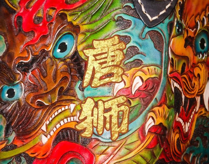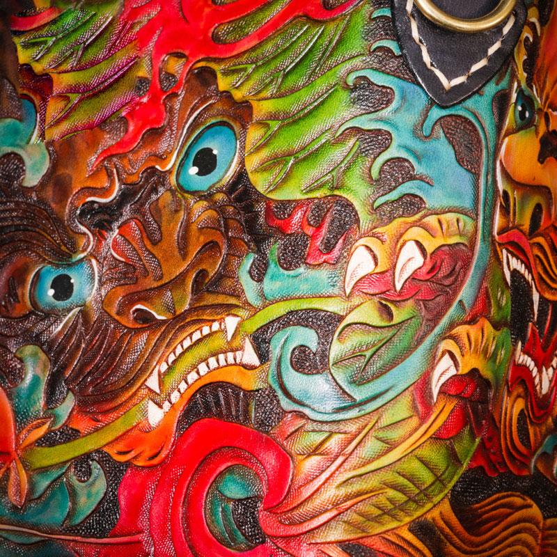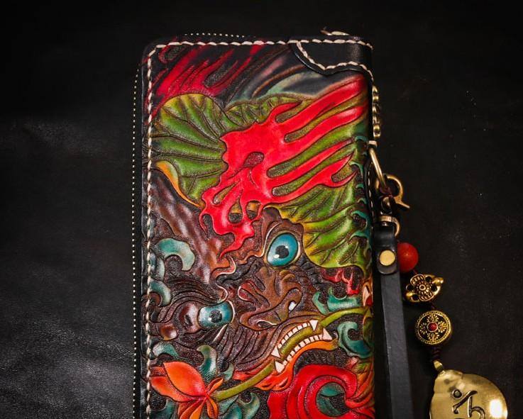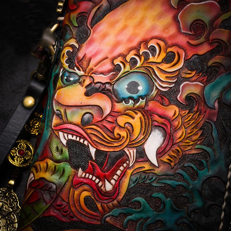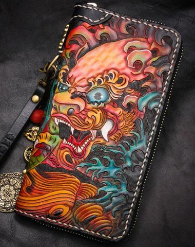 Design: Handmade Leather Tooled ChineseLion Mens Chain Biker Wallet Cool Leather Wallet Long Phone Wallets for Men