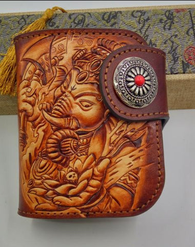Style: Handmade Leather Tooled Ganesha Mens Chain Biker Wallet Cool Leather Wallet Small Wallets for Men