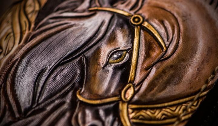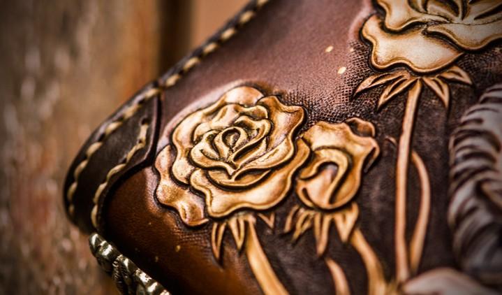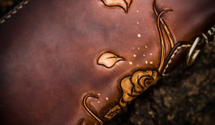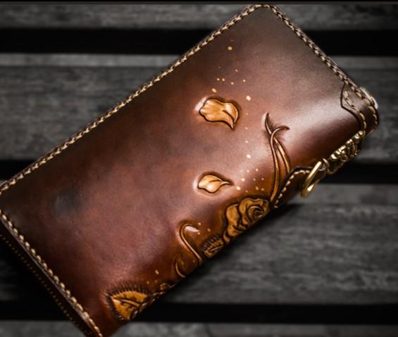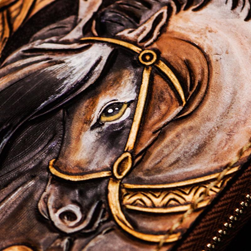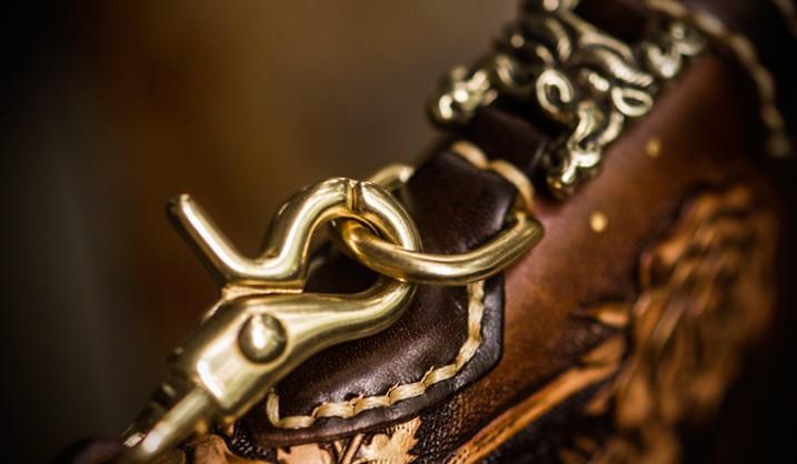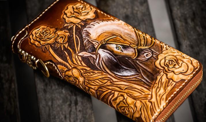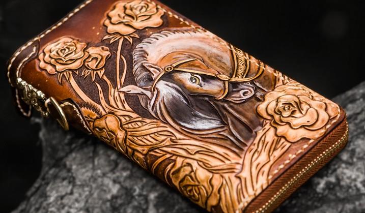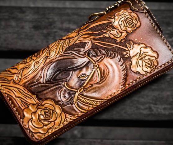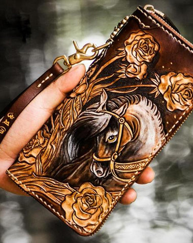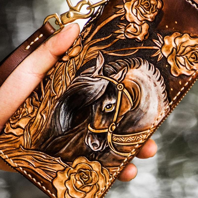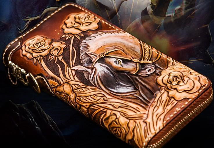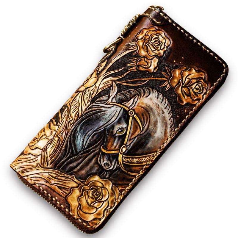 Design: Handmade Leather Tooled Horse Mens Chain Biker Wallet Cool Leather Wallet Long Phone Wallets for Men