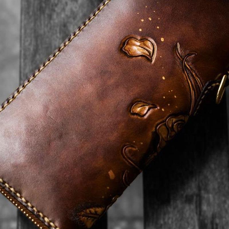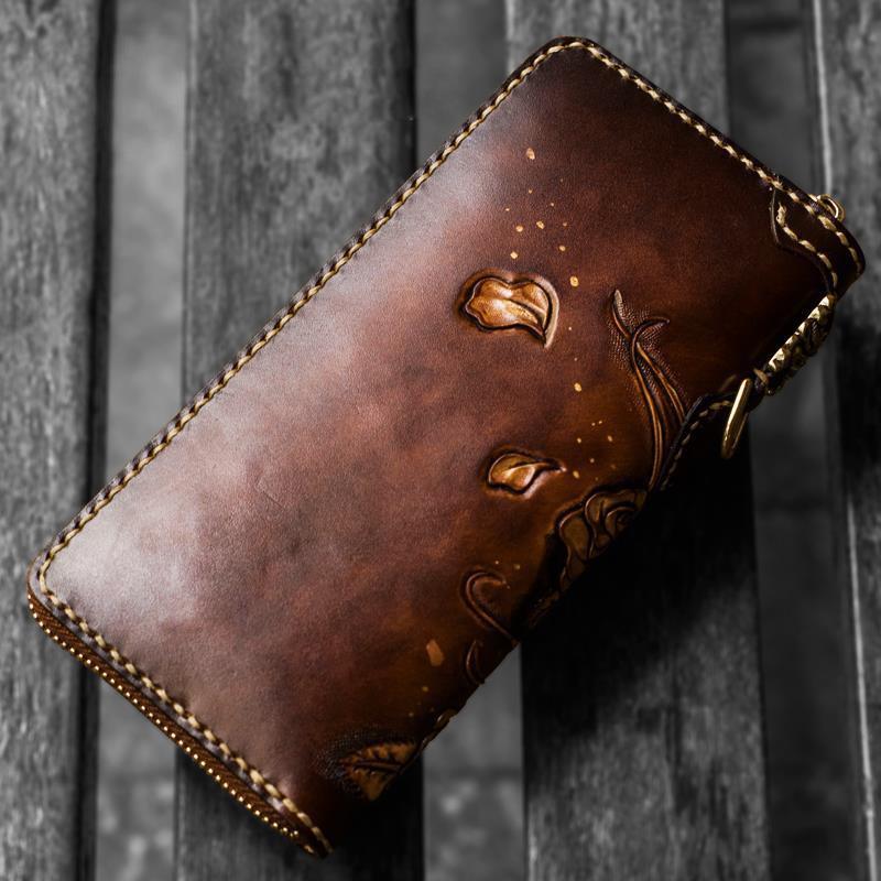 Style: Handmade Leather Tooled Horse Mens Chain Biker Wallet Cool Leather Wallet Long Phone Wallets for Men