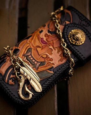 Design: Handmade Leather Tooled Prajna Mens Chain Biker Wallet Cool Leather Wallet With Chain Wallets for Men