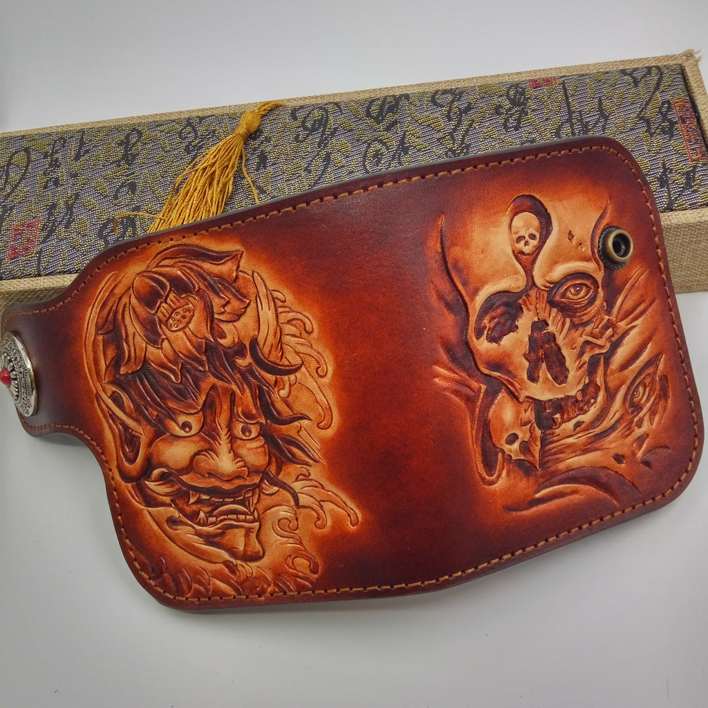 Design: Handmade Leather Tooled Skull Prajna Mens Chain Biker Wallet Cool Leather Wallet Small Wallets for Men