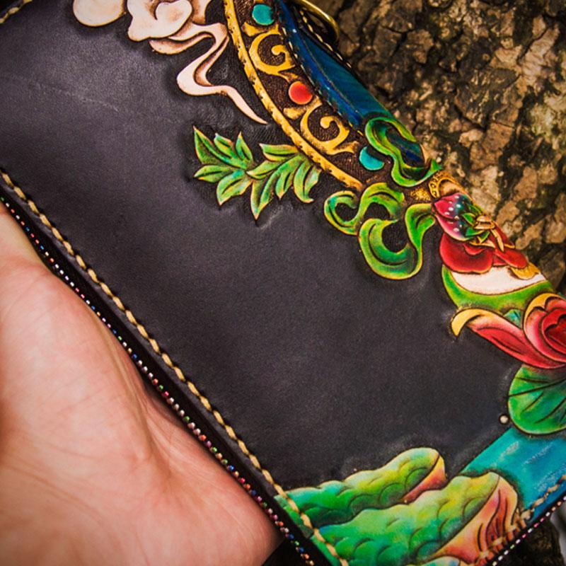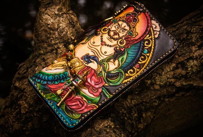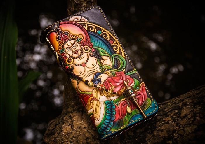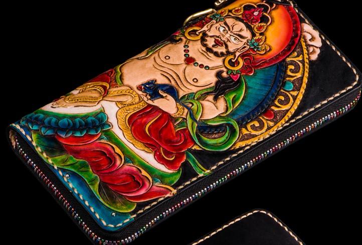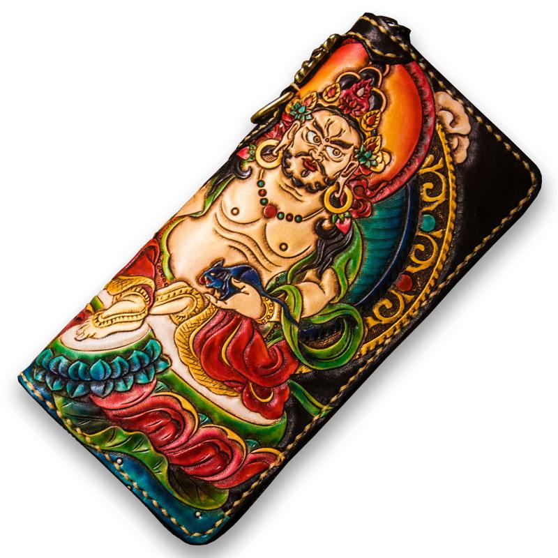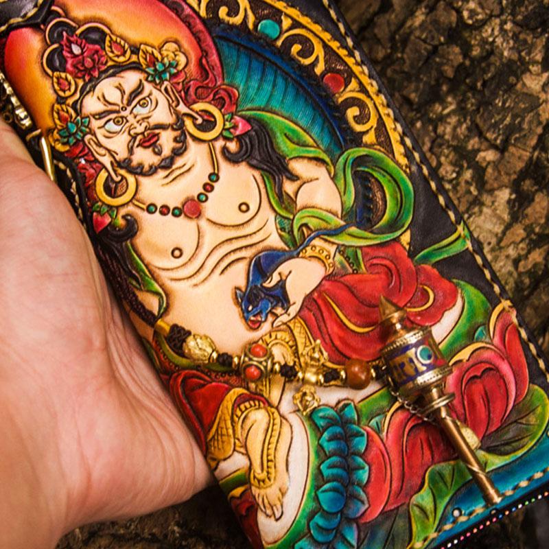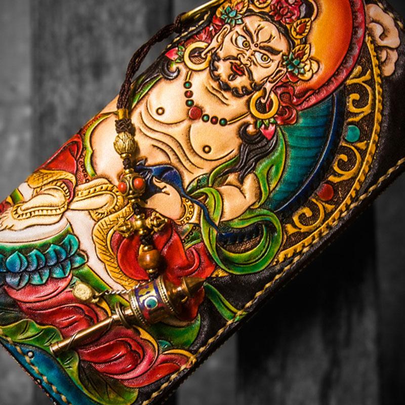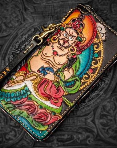 Design: Handmade Leather Tooled Yellow Jambhala Mens Chain Biker Wallet Cool Leather Wallet Zipper Long Phone Wallets for Men