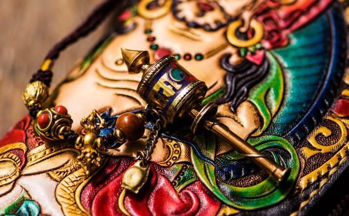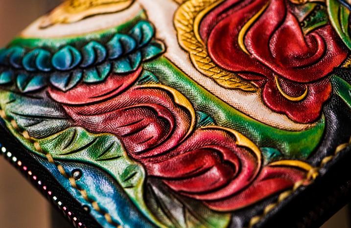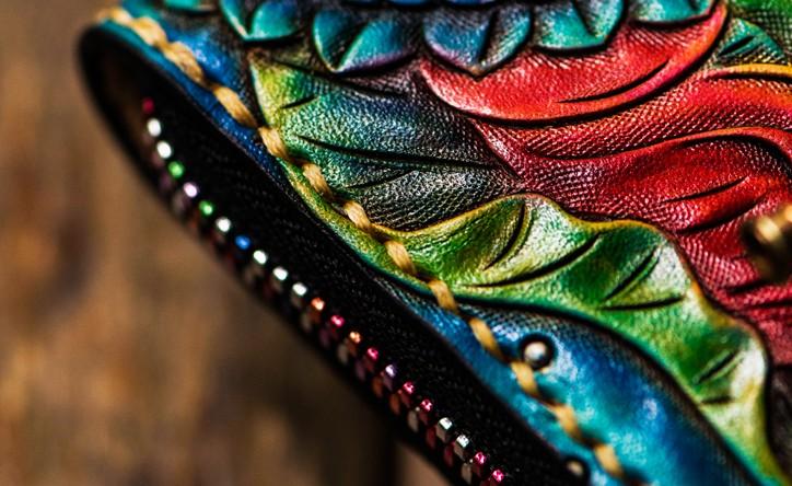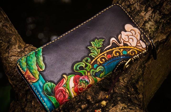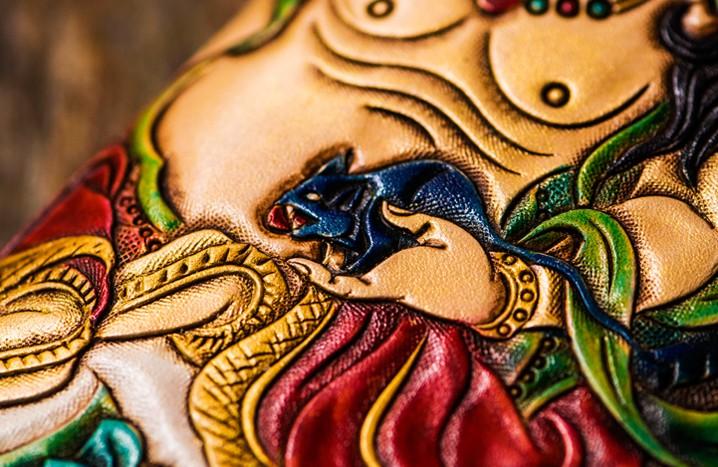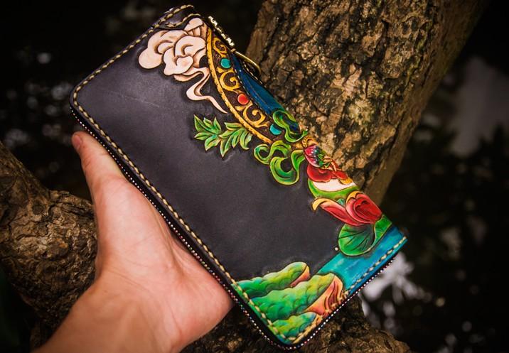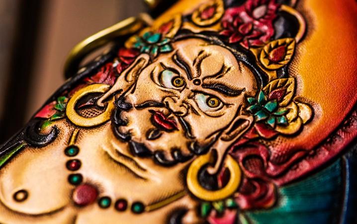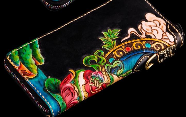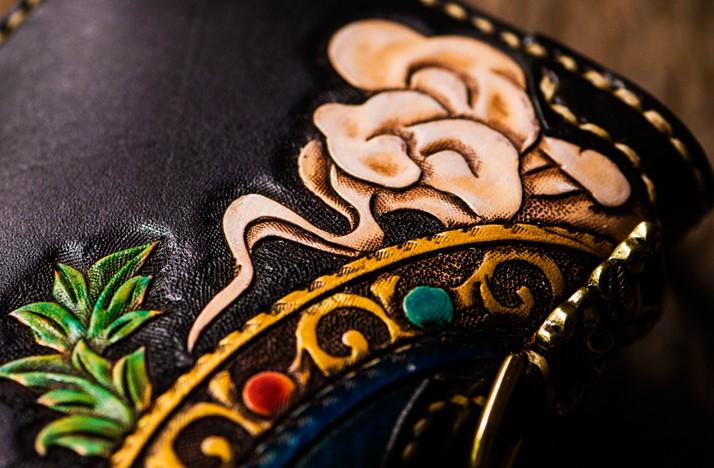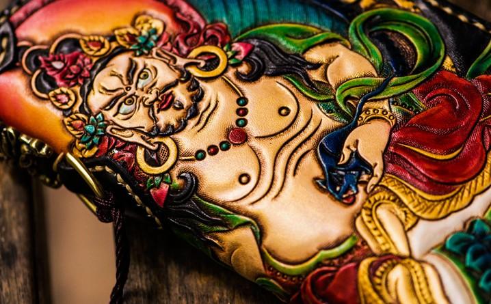 Design: Handmade Leather Tooled Yellow Jambhala Mens Chain Biker Wallet Cool Leather Wallet Zipper Long Phone Wallets for Men