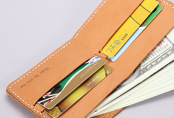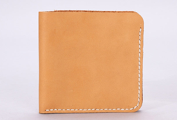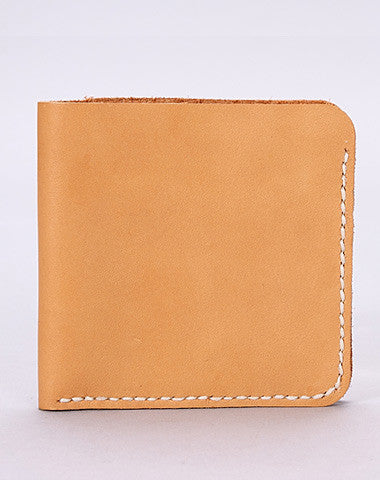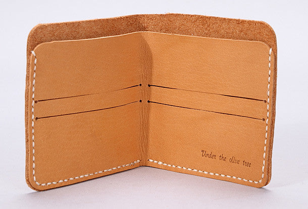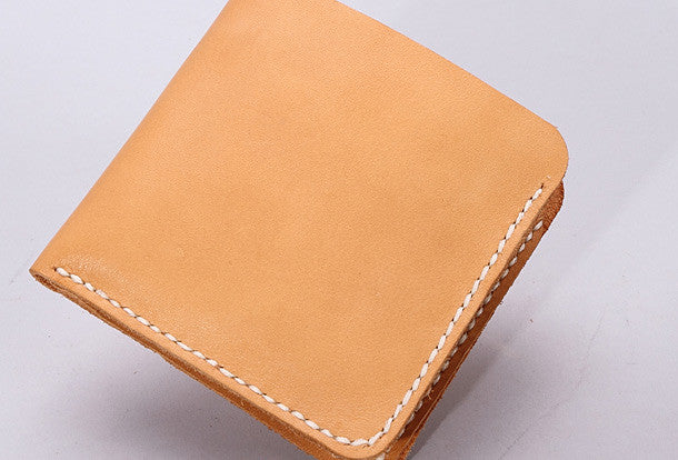 This is handcraft handmade vintage yellow?modern slim natural Italian Vegetable Tanned leather?billfold? wallet for men.The wallet is bifold,color is yellow.There are 1?full size bill slot/holder,4 ID/credit card slots/holders~Hand-made in the traditional method with punched holes and saddle stitching by hand.