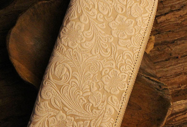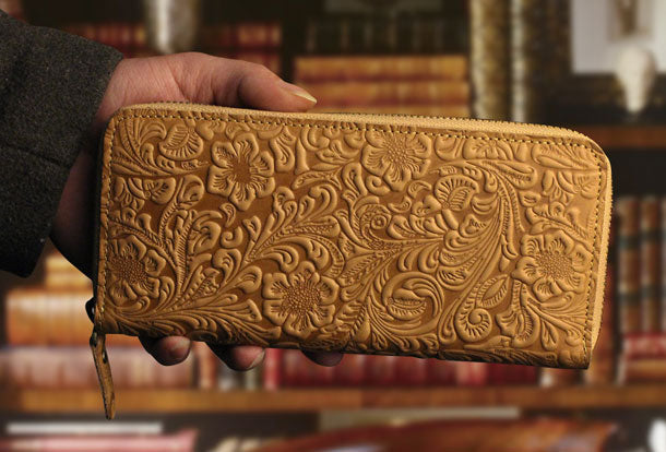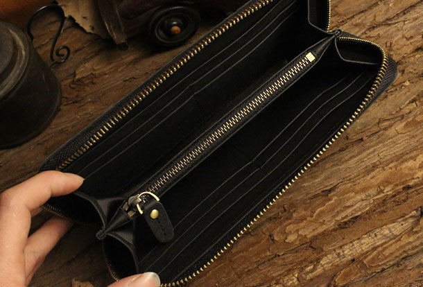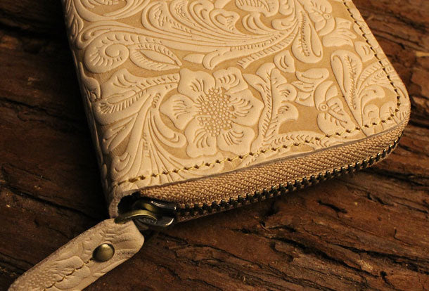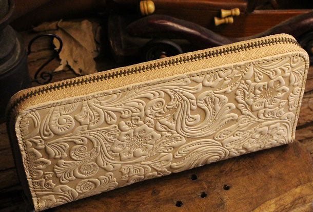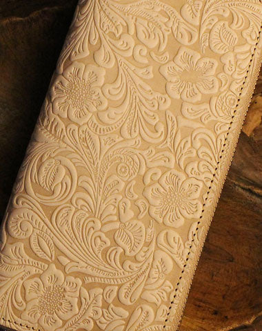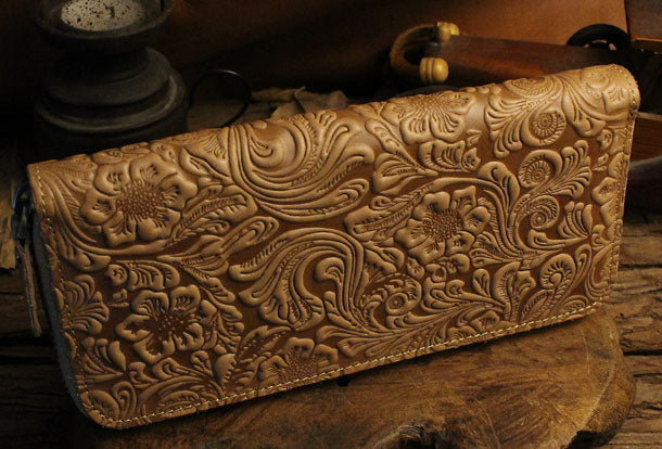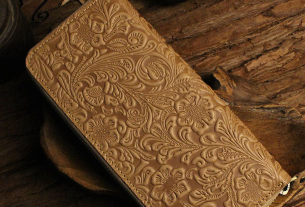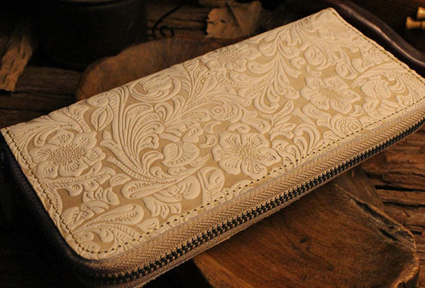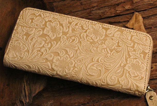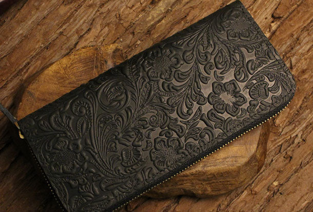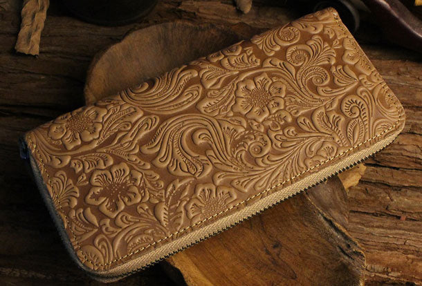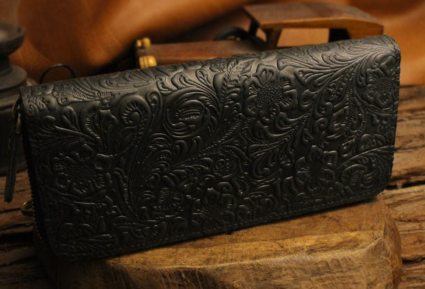 Design: Handmade long leather wallet floral leather clutch wallet for women men zip
